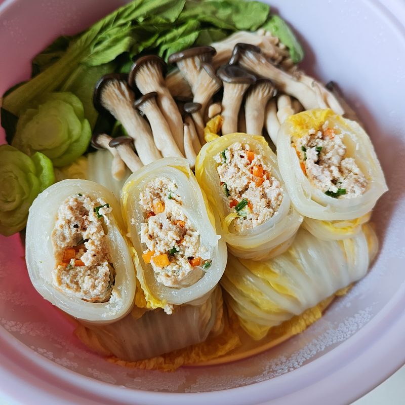 쪄준 알배추에 물기짠 두부와 다진야채, 소금후추로 간맞춰