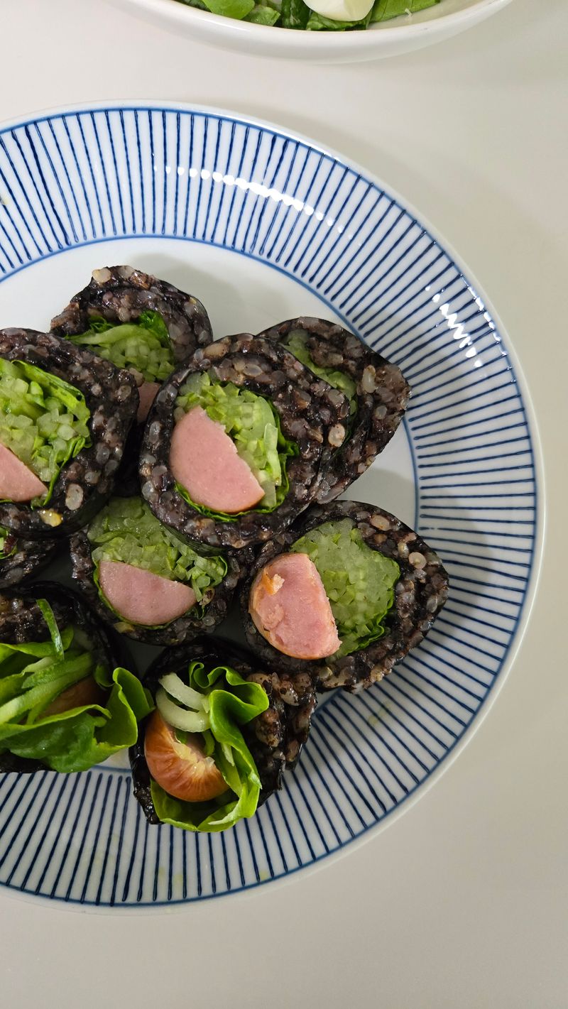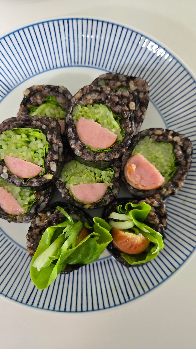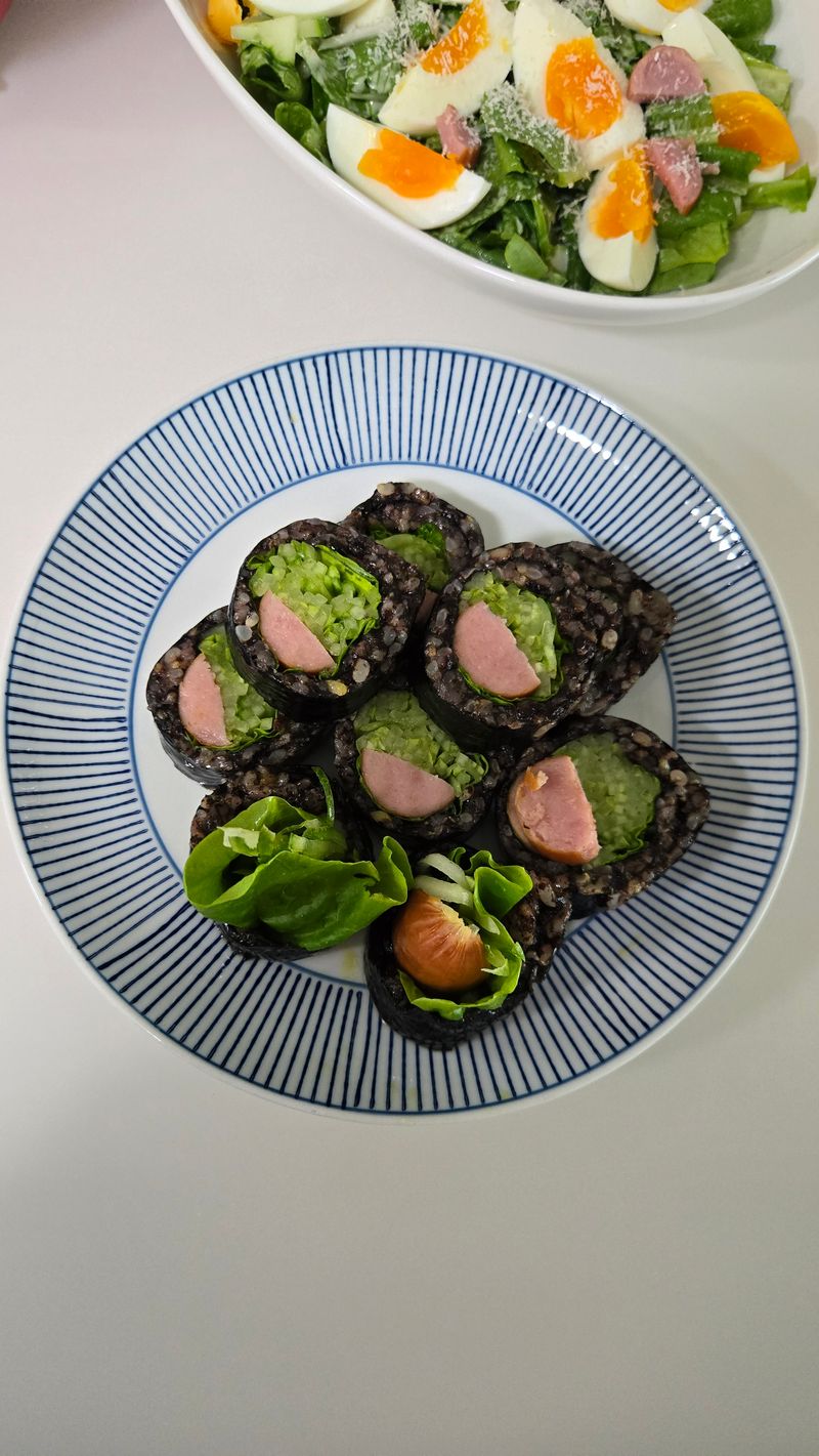 참기름, 소금 대신 김페스토로 밥에 간을 해서 김밥을 말면 감칠맛up! 소세지와 오이만 넣었지만 김페스토와 세가지 조합이 완전 찰떡이었습니다.