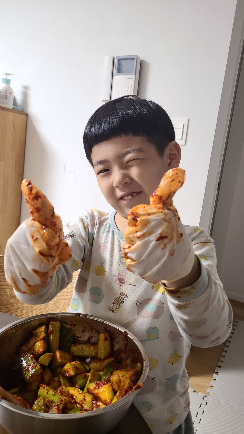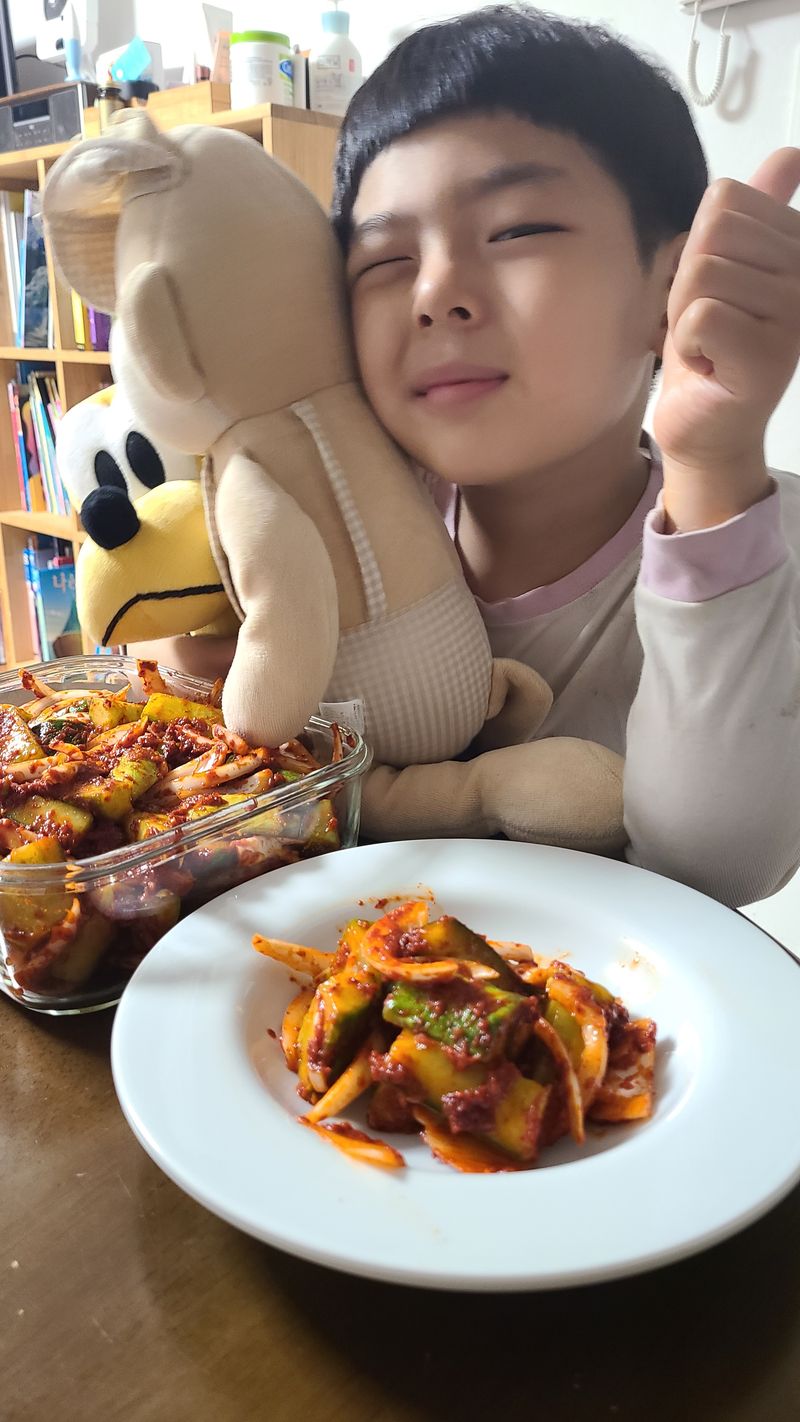 7살 아들과 오이김치 만들었어요 부추를 넣어야 하는데 집에 양파밖에 없어서 오이양파김치 만들었어요 새미네 오이양념 너무 맛있어서 정말 손쉽게 후다닥 오이양파김치 완성입니다요 물론 맛도 👍 최고 입니다