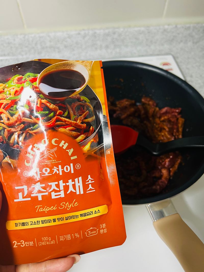 냉장고에 파프리카 2개가 있길래 어떤 요리를 해볼까~ 고민을 하다가 차오차이고추잡채 소스가 있길래 뚝딱만들어보았습니다.