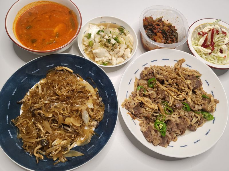 고기 안 들어간 잡채인데도 너무 맛있고 숙주 대신 넣은 팽이버섯과 우삼겹의 조화는 말모말모