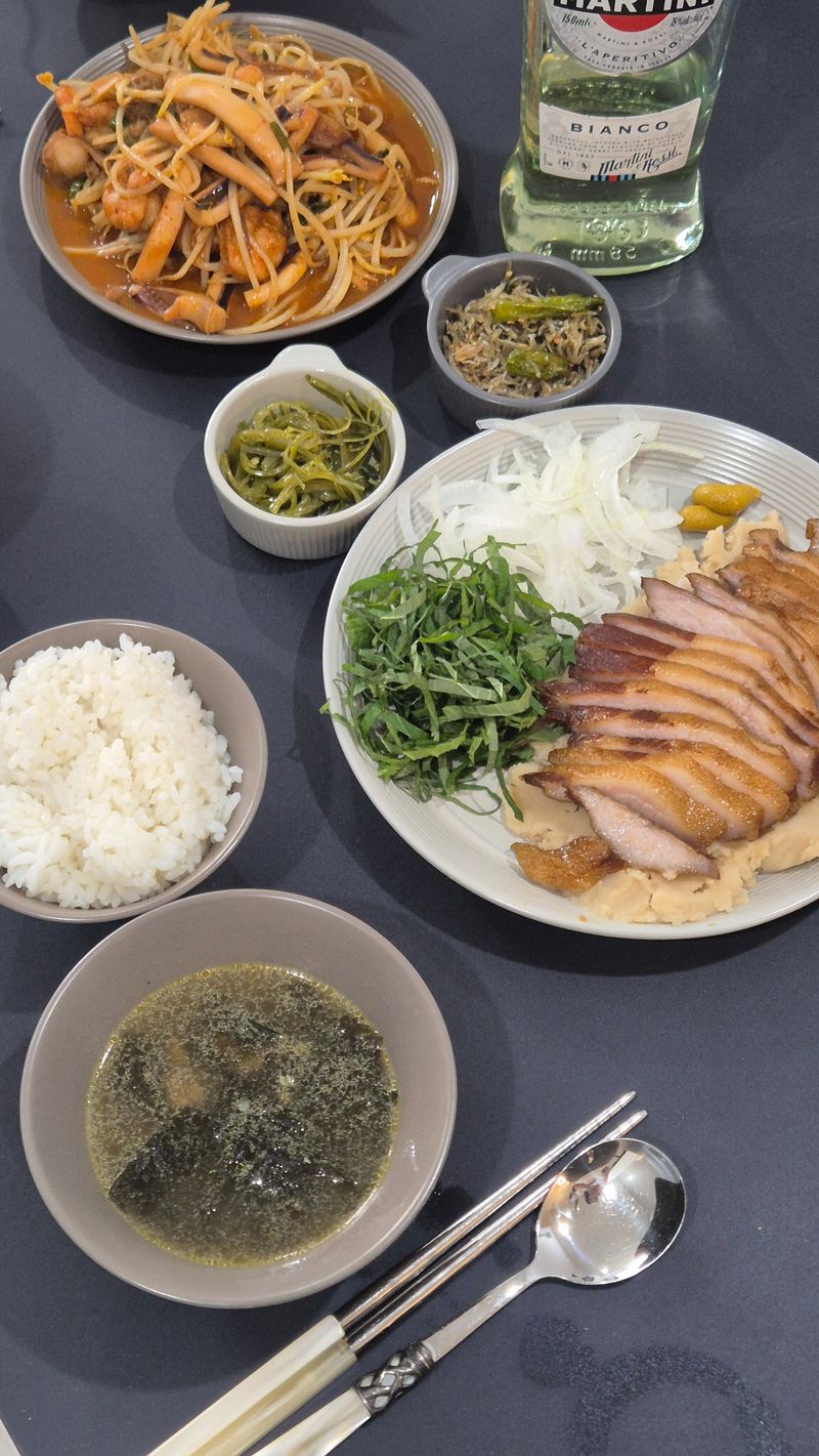 생일 맞이 미역국, 해물찜 매쉬드포테이토 곁들인 항정살조림 에 밑반찬 미역줄기볶음, 멸치볶음까지 직접 만든 정성스러운 생일상입니다 :)