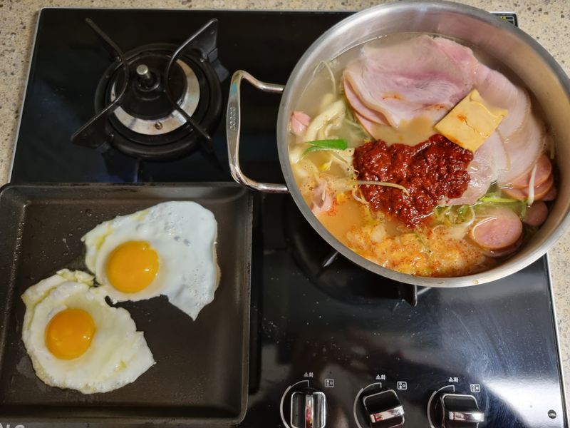 갖은 야채와 햄, 두부, 우동 사리를 넣고 고춧가루를 넣어 부대찌개를 만들었어요
