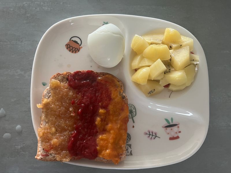 아침에 토스트와 직접 만든 3종 쨈과 함께 식사해요 시판보단 덜 단데도 아이들이 잘먹어줘서 언제가부터 구매하지 않고 만들어 먹네요 딸기쨈,사과쨈,살구쨈