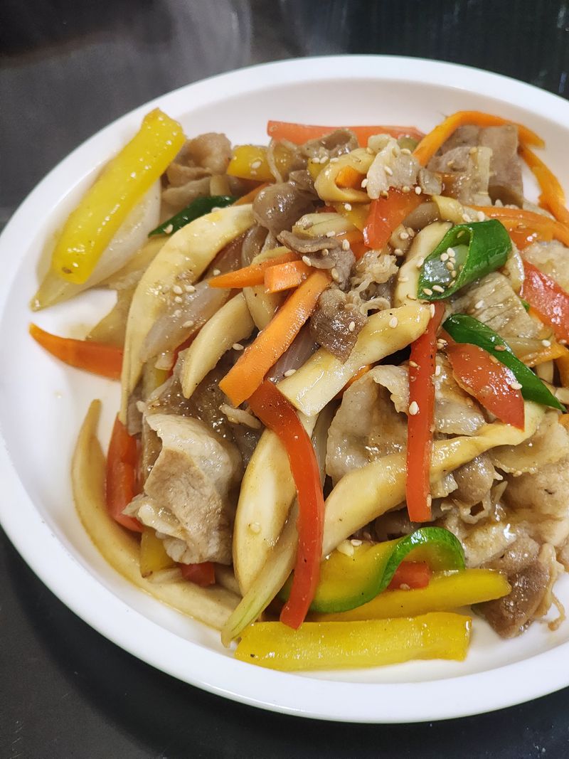 냉장고 파먹기에 좋은 대패삼겹야채볶음 당면없이 잡채느낌 내기 좋고 야채 고기 골고루 먹을 수 있어서 좋고 너무나 간단해서 좋은 메뉴네요. 고추잡채느낌도 물씬 납니다. 냉장고파먹기에도 더없이 좋은 메뉴입니다. 다른 간 많이 할 필요도 없고 연두 1~2스푼이면 완성입니다.