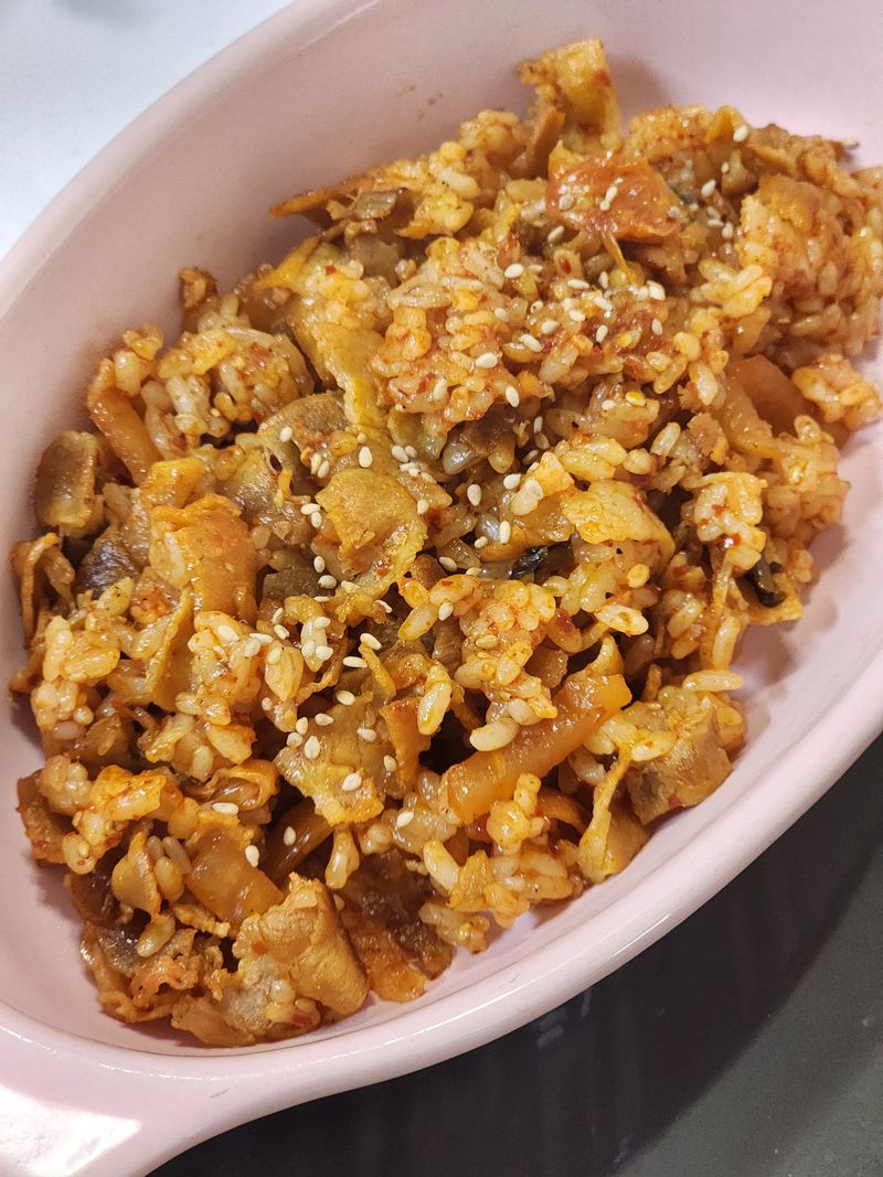 대패삼겹을 볶다가 김치양념만 넣고 밥과 함꼐 달달 볶아서 만든