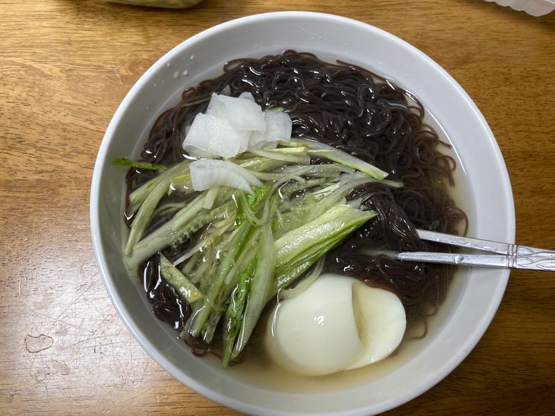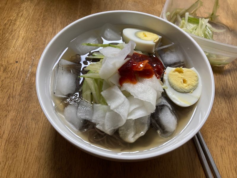 냉면이긴 한데 요리랄게 없이 파는 냉면 육수에 물을 1:6정도로 희석해서 얼음 담고 잘게 썬 오이, 삶은 계란, 파는 초절임 무를 얹어서 만들어요.