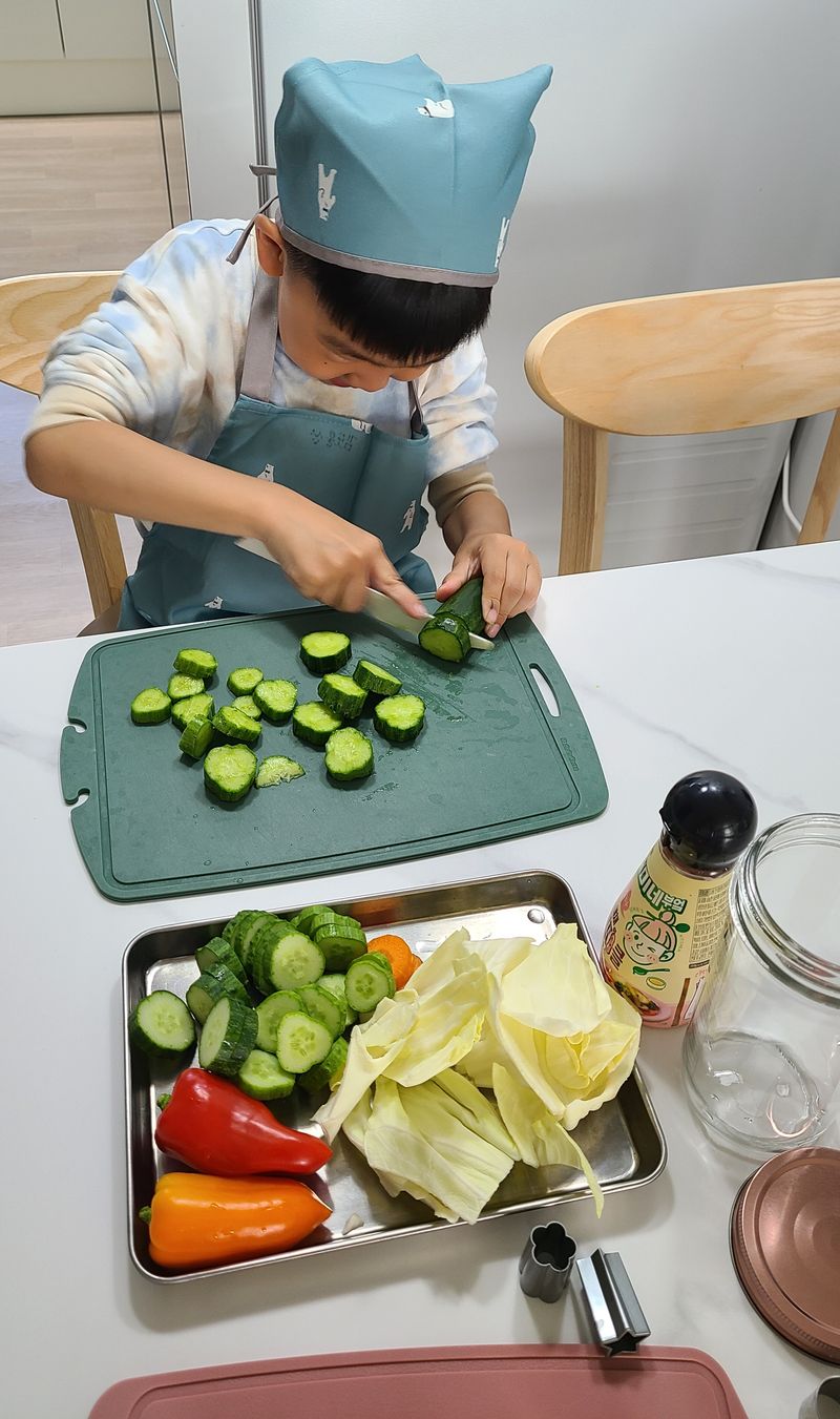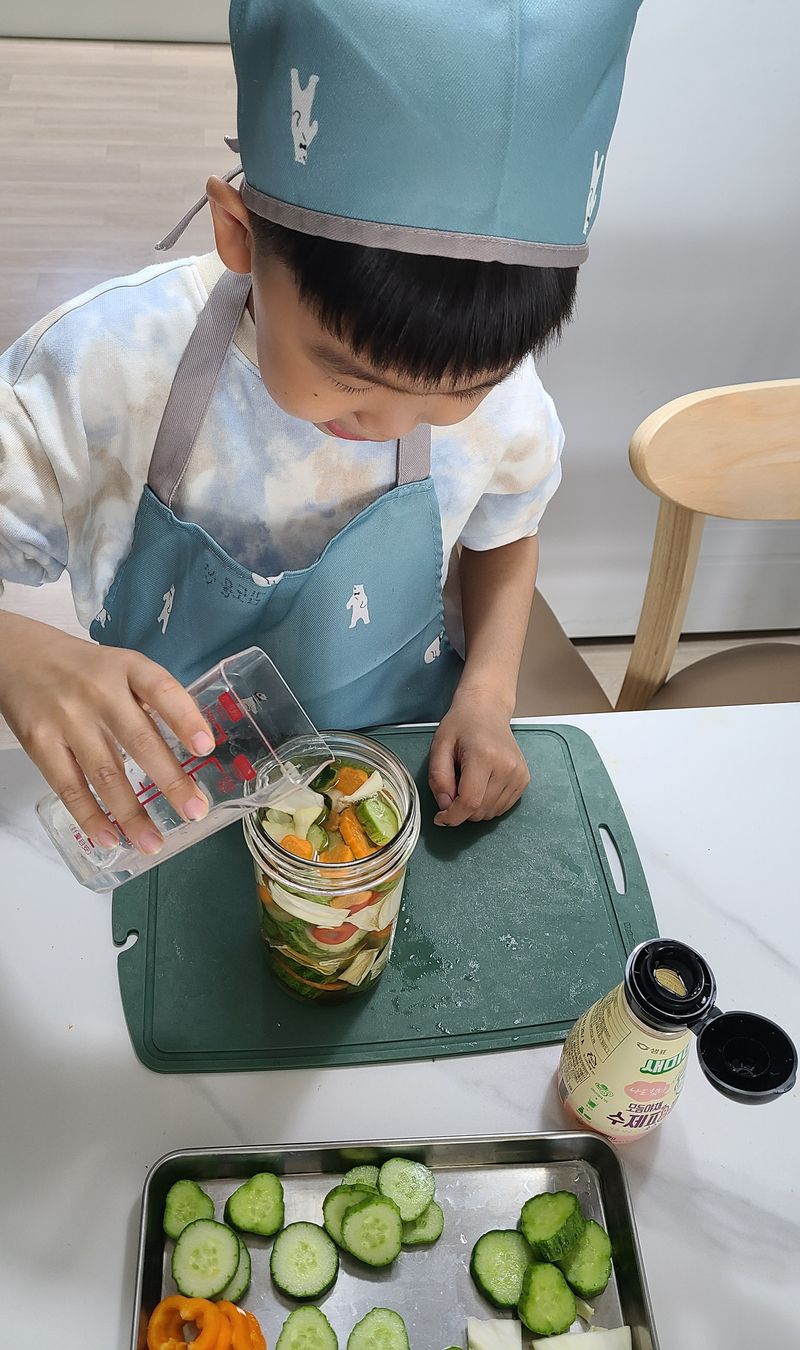 오늘은 아이랑 피클만들기에 도전했어요~^^ 새미네피클소스가 있어서 손쉽게 완성했습니다~ 평소 잘 안먹는 야채들을 직접 잘라보고 아이가 스스로 만들었다는것에 뿌듯해합니다! 이젠 야채를 좀 좋아하겠지요~^^