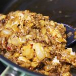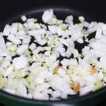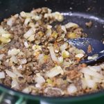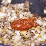 달궈진 팬에 오일을 두른 후 마늘과 양파 > 토마토 > 고기 순으로 볶아주세요.