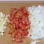 가지가 구워지는 동안 가지피자 안에 넣을 속재료를 만들거에요. 양파와 씨부분을 제거한 토마토는 잘게 썰고 마늘은 다져주세요.
