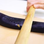 세척한 가지를 도마 위에 놓고 밀대로 가지를 밀어주세요, 가지는 속이 스폰지 같은 질감이라 힘을 가하면 납작해져요