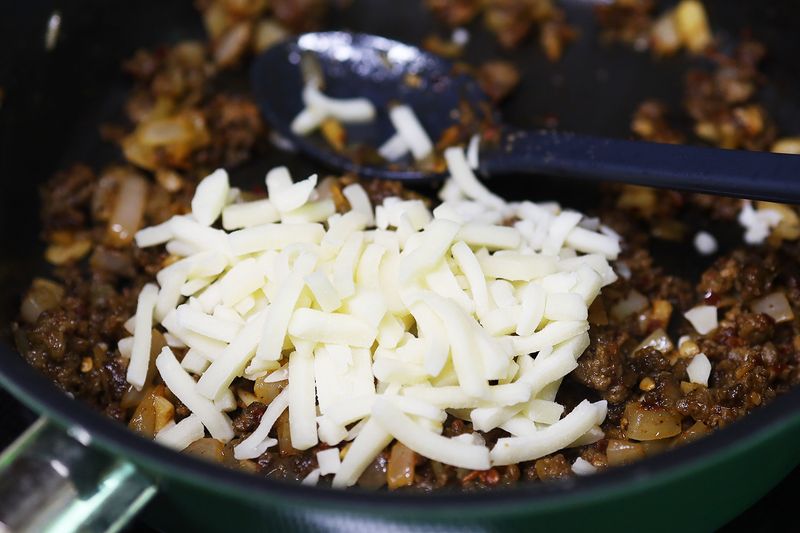 모짜렐라 치즈를 살짝 뿌린 다음 만들어둔 속재료를 넉넉하게 채우고 모짜렐라치즈+슈레드치즈로 마무리해주세요. 다시 에어프라이어에 넣고 190도에서 5-6분간 구워주세요.
