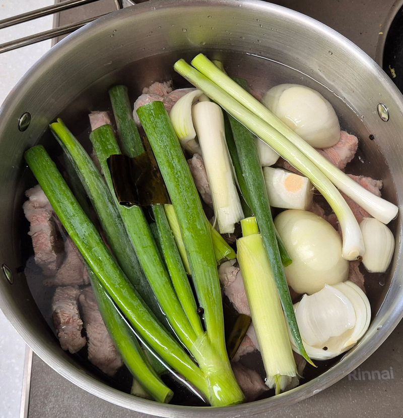 3.갈비가 물러지면 양파,대파,다시마,통후추를 건져내고