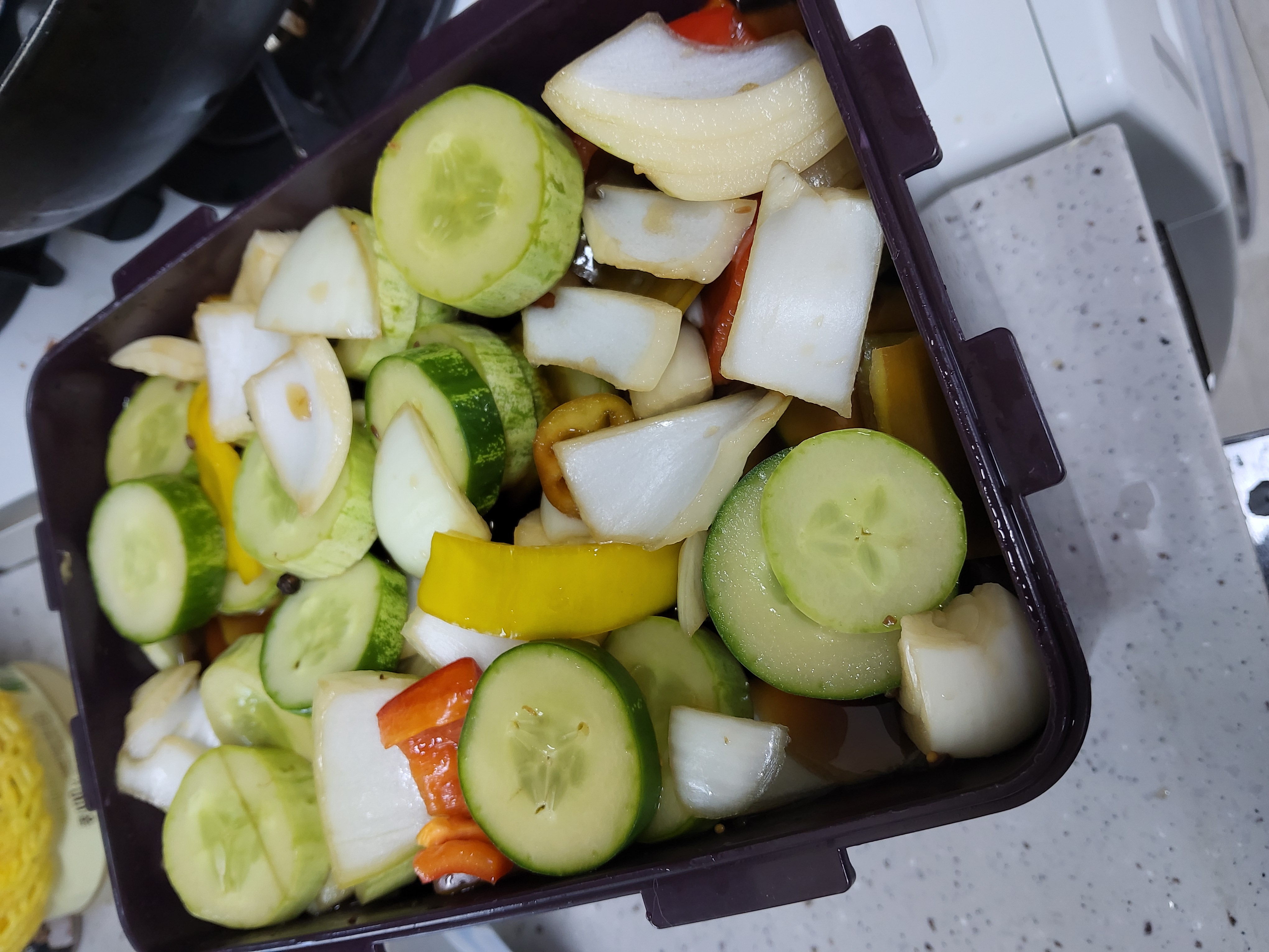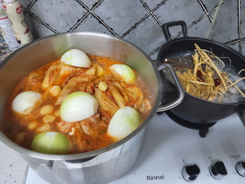 닭두마리로 김치찜 한솥. 삼계탕 한솥 아침에는 삼계탕으로 점심 저녁에는 닭김치찜으로 집밥해결 여름 든든하게 말복을 보내다. 요즘 싼오이와 양파로 오이양파피클을 만들어 함께 먹으면 개운한 밥반찬으로 최고다