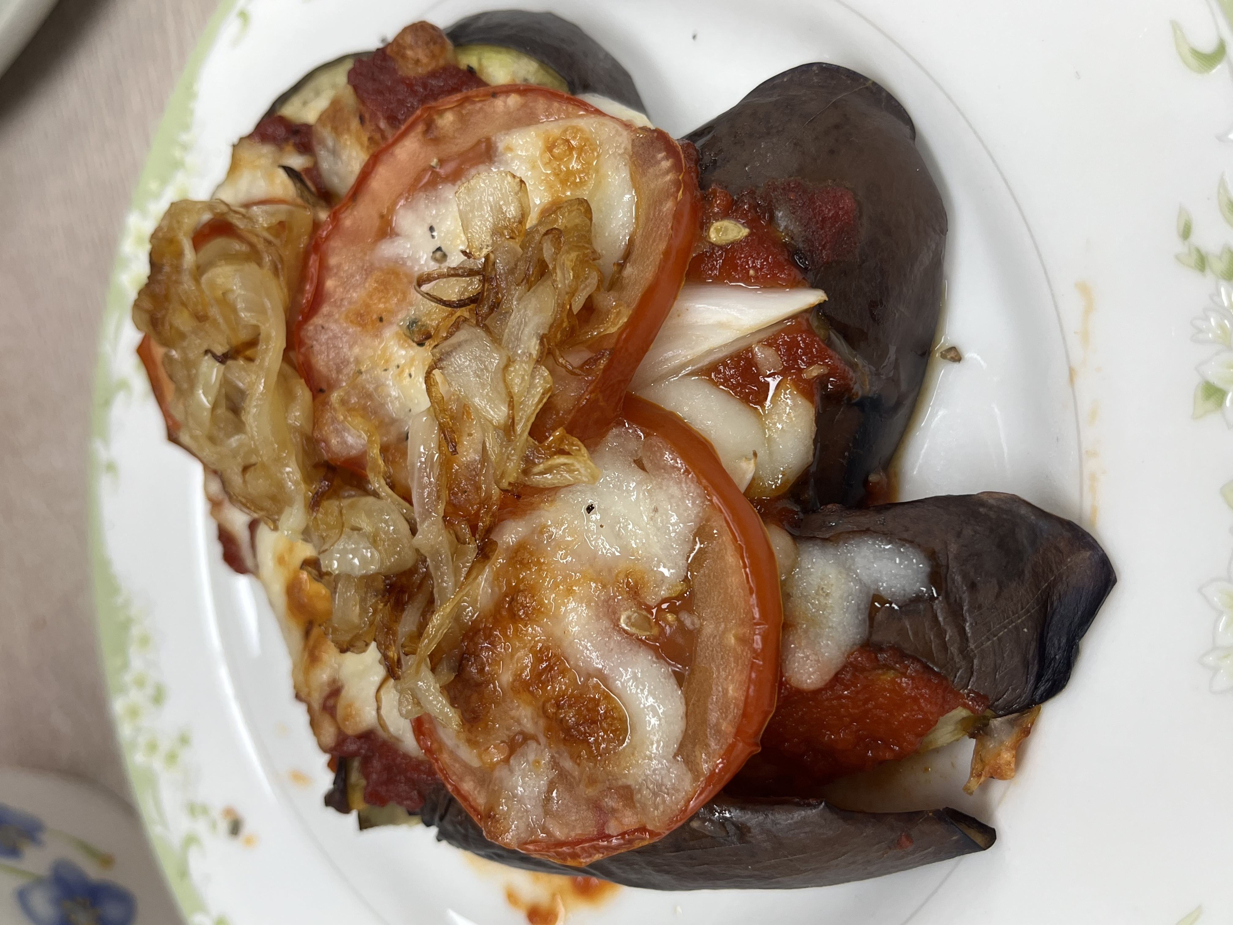 가지가 도우가 되는 가지피자에요 꼭지를 자르지않고 얇게자르는게 포인트입니다 가지위에 올리브유뿌리고 토마토소스 소금후추 갈갈해주고 피자치즈 토마토 양파올리고 180도 에프8분 해주세요