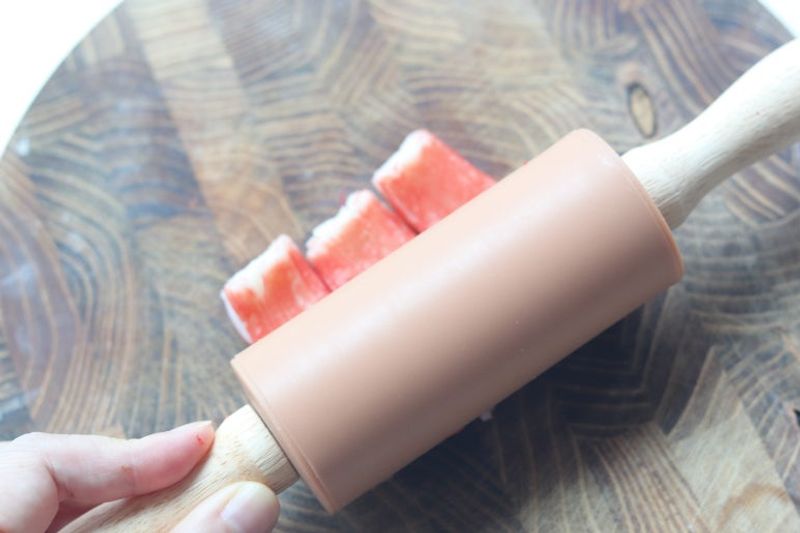 크래미는 밀대로 납작하게 밀어 줍니다.