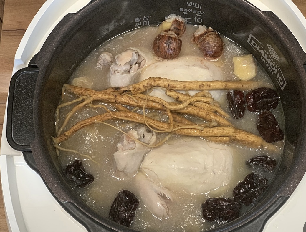 황기, 대추, 마늘, 밤 넣었지요~ 찹쌀은 아래에 깔고요~ㅎ닭이 잠기도록 물을 넣었어요! 50분 후 누룽지백숙이 아주 잘 되었어요.