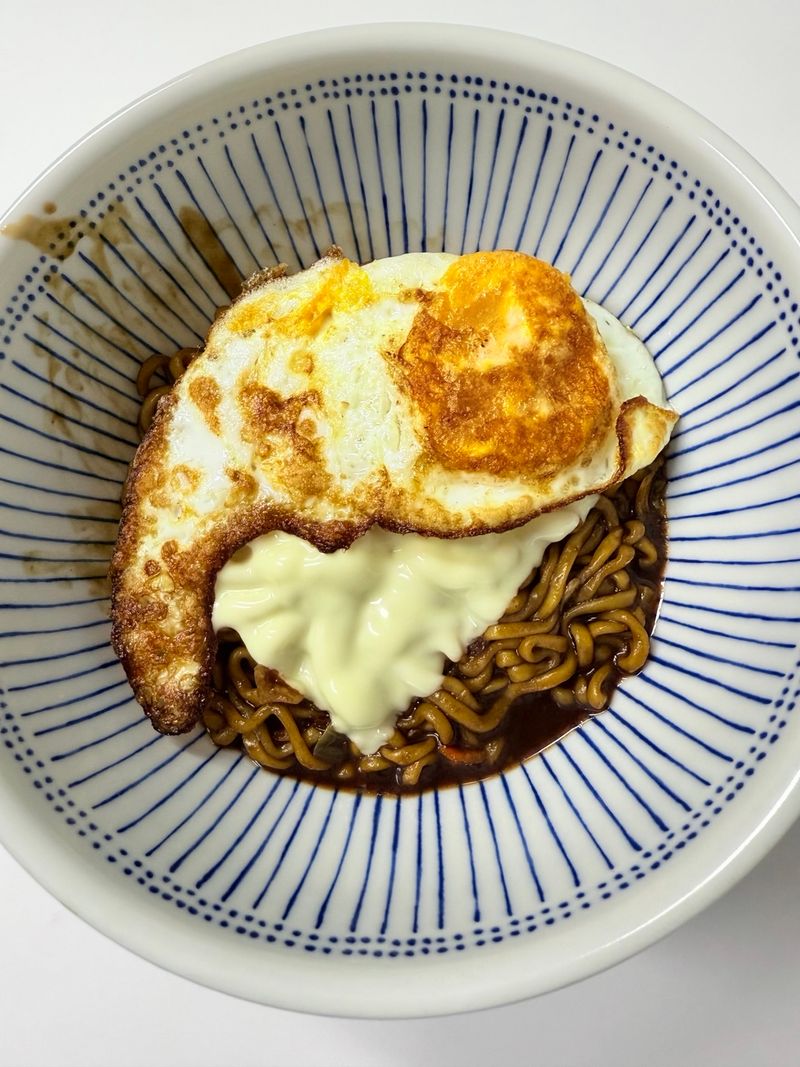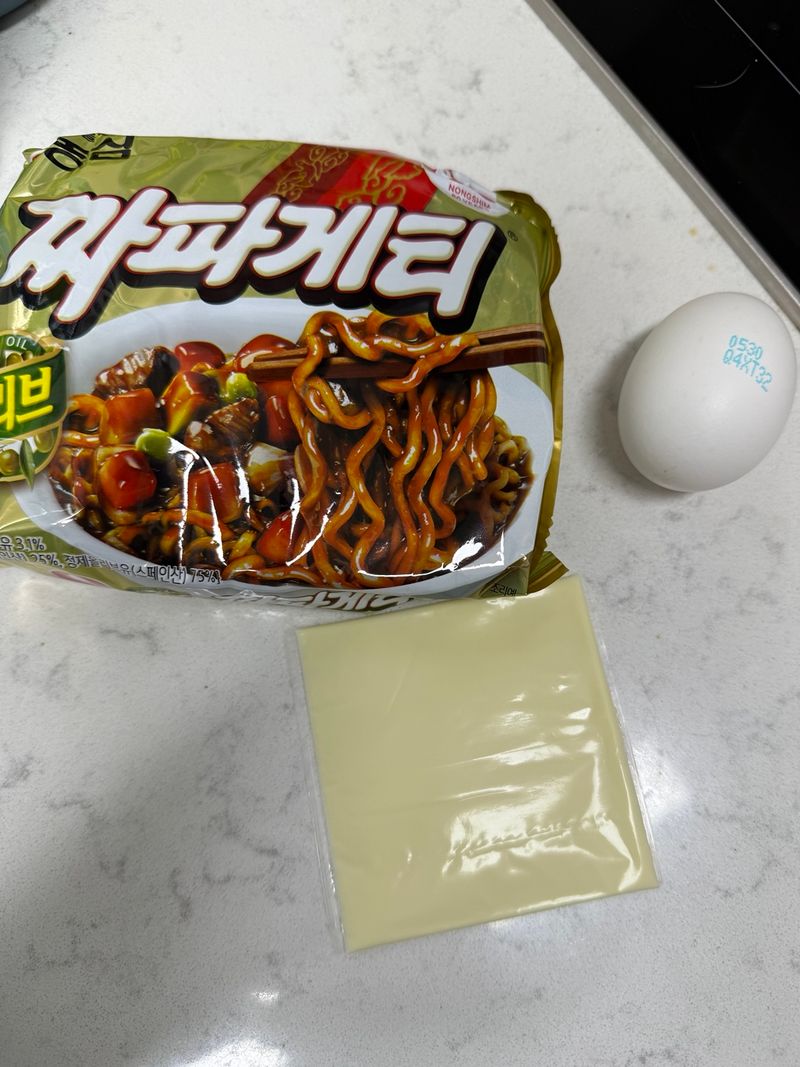 바로 짜파게티 + 계란 프라이 + 치즈 조합이에요.