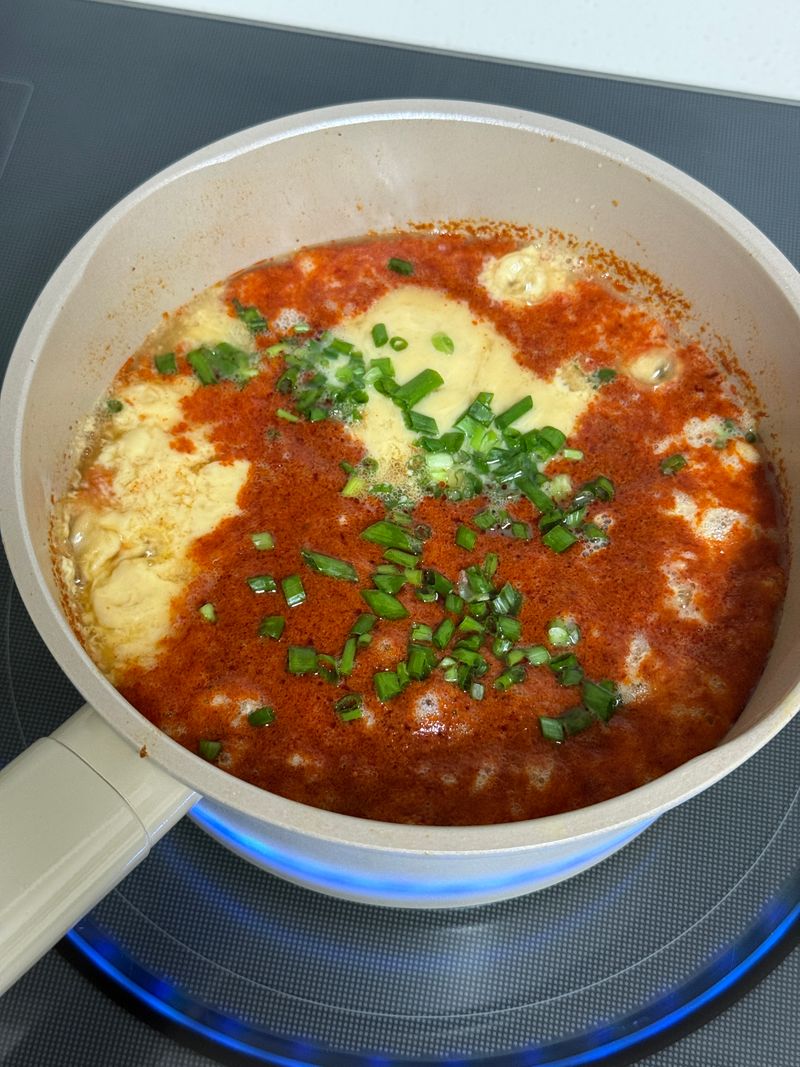 고춧가루 먼저 볶다가 계란물 투하하면 끝나는