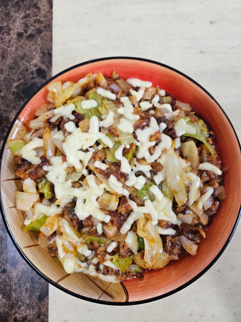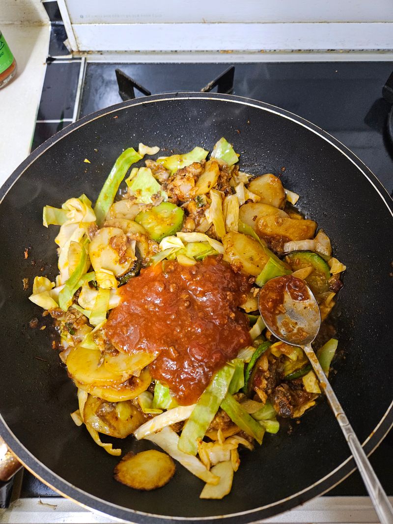 4. 감자와 애호박의 달큰한 향이 올라오면, 육전과 양파, 양배추를 넣고 볶아준다.