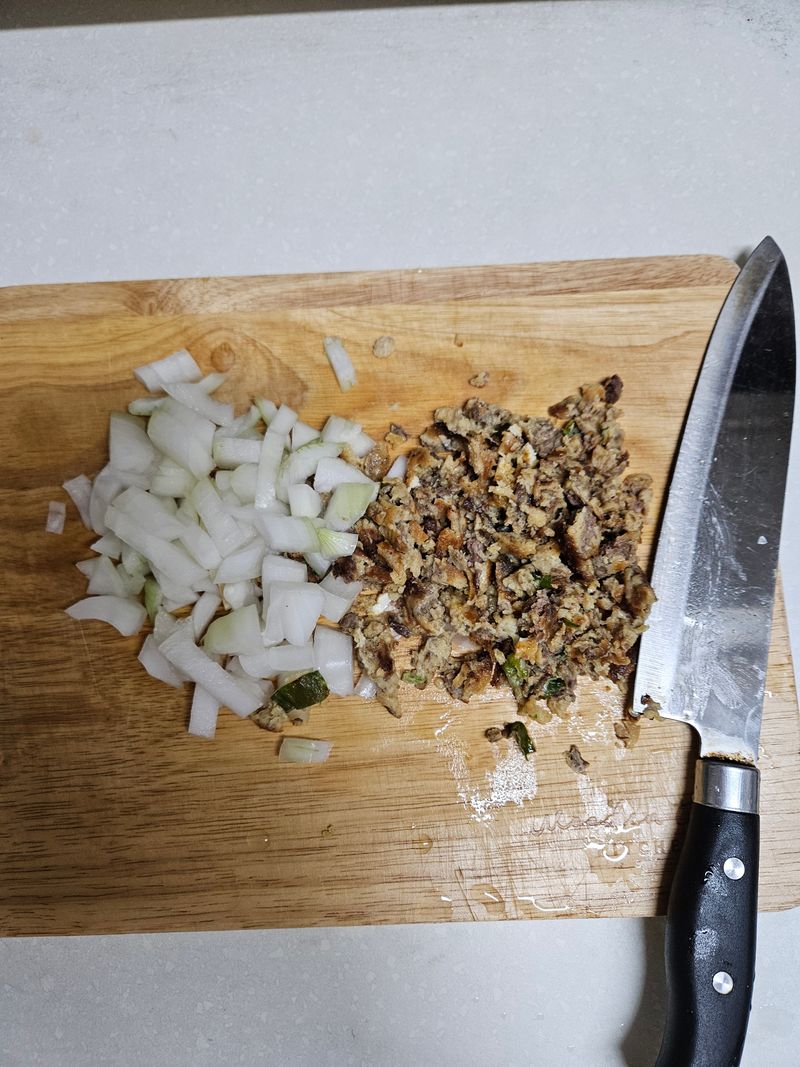 2. 양파는 깍둑썰기, 육전은 작게 다지듯 썰어준다. QICK!