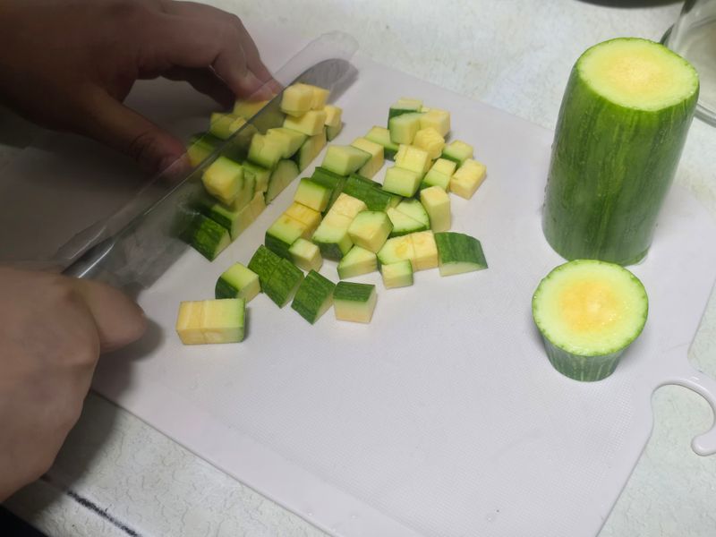 먼저 애호박부터! 인큐(비닐) 벗기는 방법부터 따라해보려했는데 바로 실패해버렸어요 ㅋㅋㅋ 힘으로 뜯어버리고 짜장용으로 깍둑썰기를 했는데요. 야채손질 가이드에서 본 두가지 방법 다 해보았는데 길게 썰어서 하는게 더 빠르고 예쁘게 되는 것 같아요~