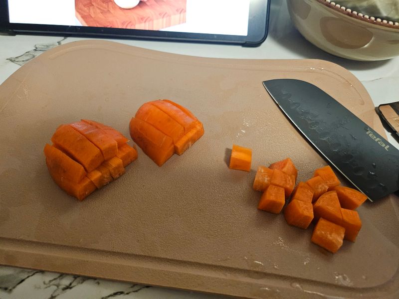 근데 처음으로 칼질 연습 챌린지를 하면서 주방에서 즐거움을 느낄 수 있었습니다. 칼을 잡는 방법이 있다는 것도 처음 알았는데, QR코드에 안내된대로 칼과 손잡이 사이를 잡고 자르니 손목이 아프지도 않고 정확도도 올라 너무 쉽게 뚝딱 재료 손질을 할 수 있었습니다. 하다 보니 다른 재료도 마구 자르고 싶어졌지만 겨우 참았습니다.ㅎㅎ🔪