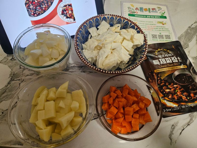 짜장을 만들기 위해 양파, 당근, 감자, 양배추를 손질했는데, 4가지 재료 모두 상세히 안내된 방법 그대로 따라 하기만 하면 끝나서 너무 놀랐습니다. 새미즈 덕분에 효율적으로 요리하면서 주방에 대한 두려움도 점점 사라지고, 요리가 즐겁게 느껴졌습니다!🫶