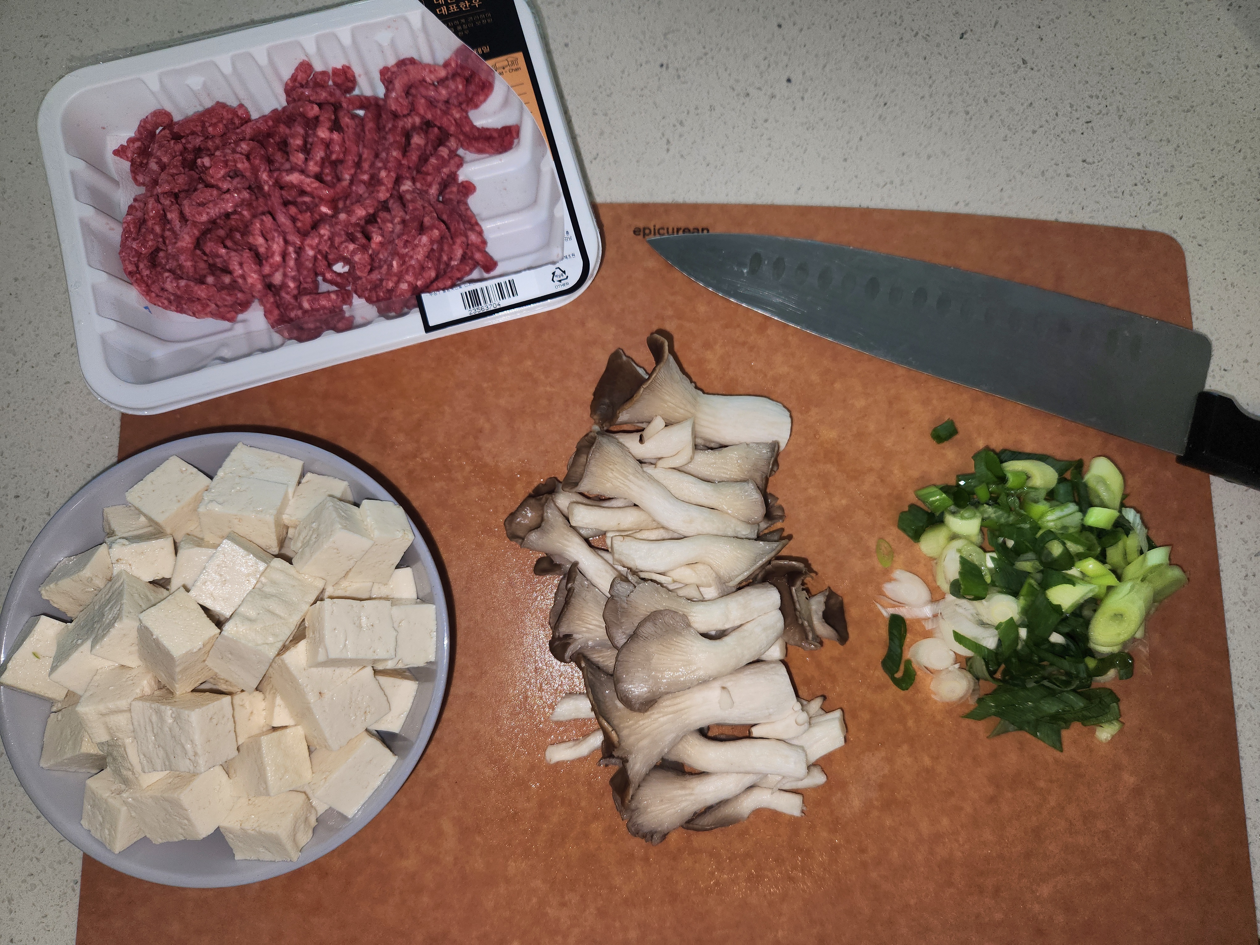 저는 연두부 대신 찌개용 두부를 사용했고요, 집에 남아 있던 소고기 다짐육을 넣고, 버섯도 추가해서 식감을 살렸어요. 두부의 부드러움에 버섯의 쫄깃함이 더해지니까 훨씬 풍성해졌달까요?