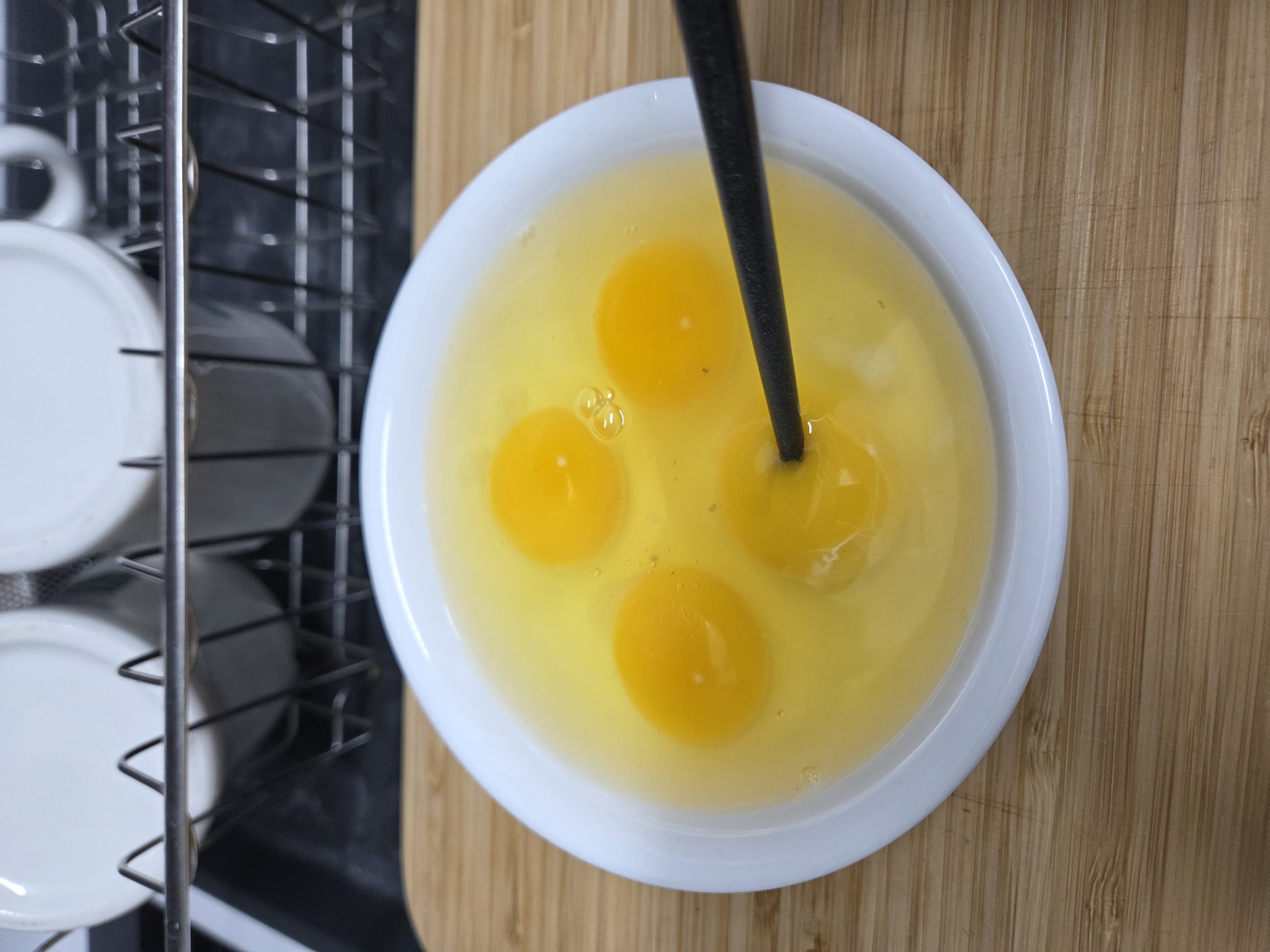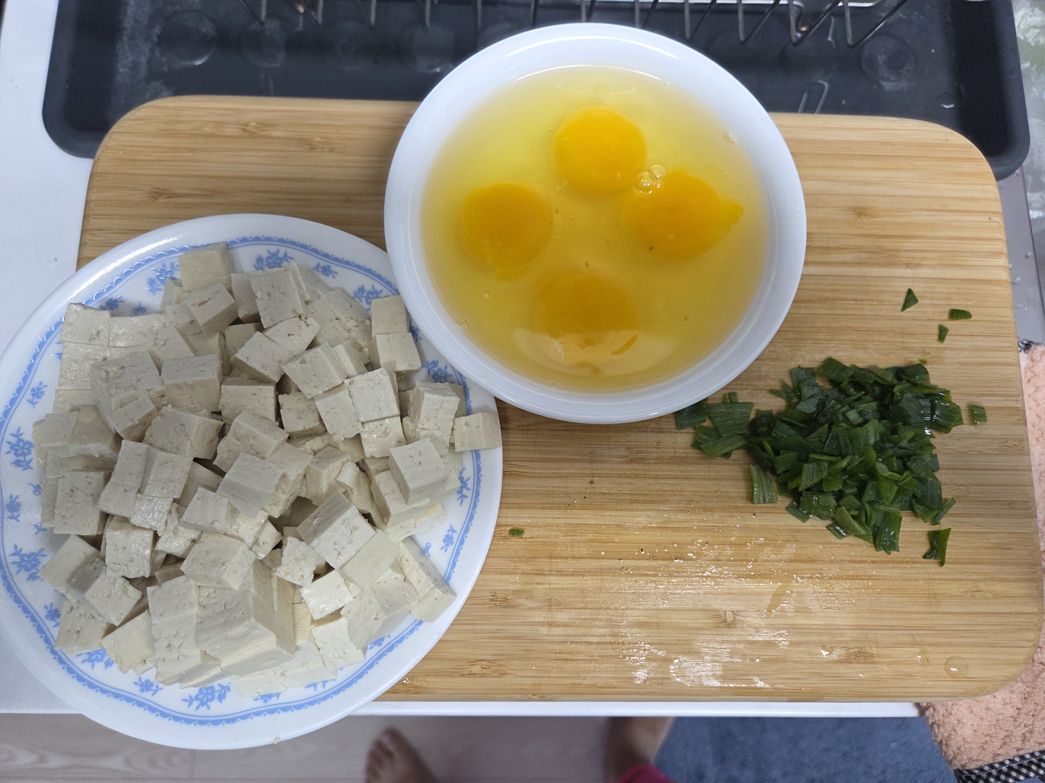 두부는 작게 깍뚝썰기로 준비해주고, 달걀 4개를 젓가락으로 노란자만 꼭 찍어준다. 그리고 쪽파를 다져놓으면 재료준비 끝