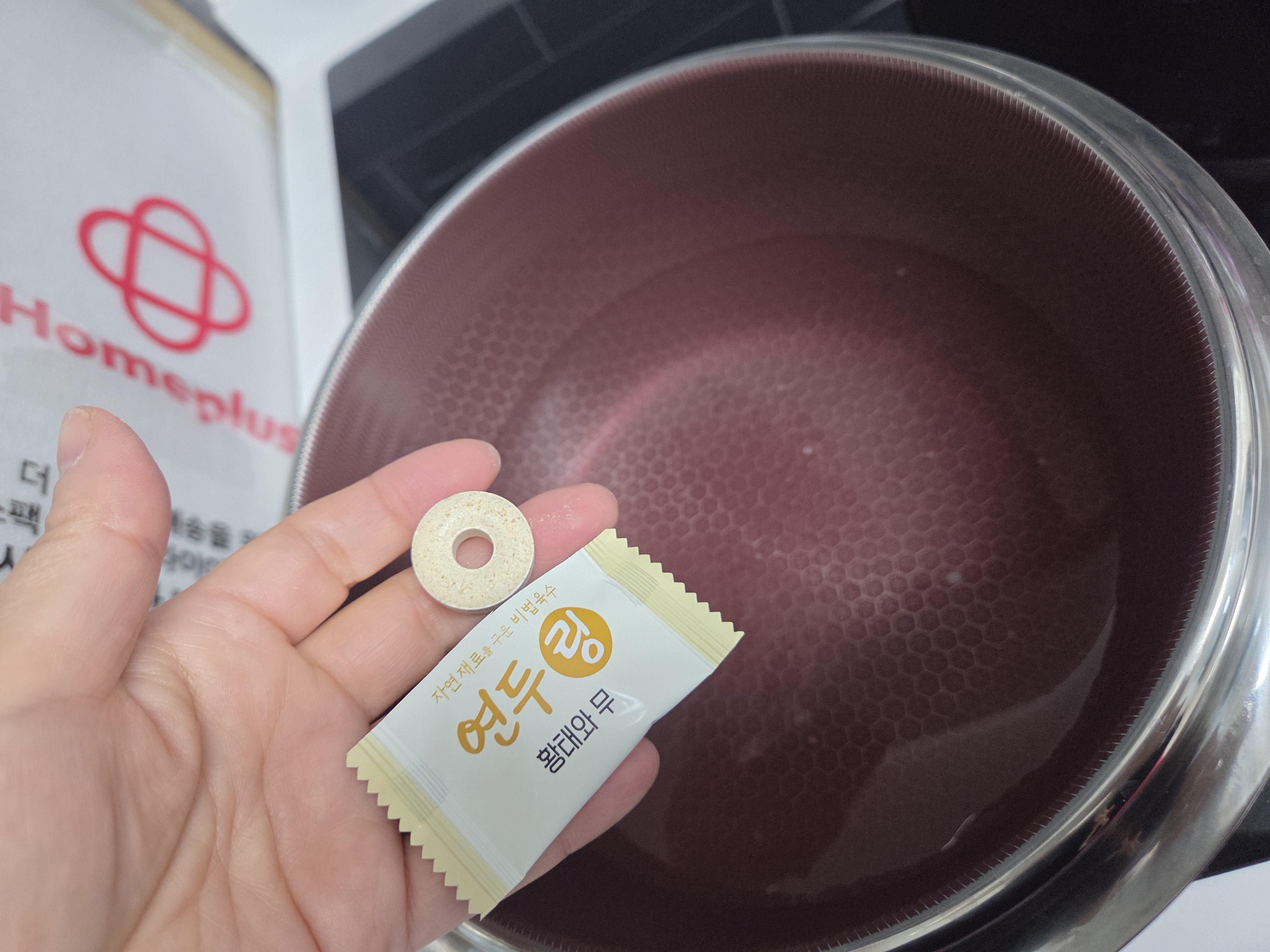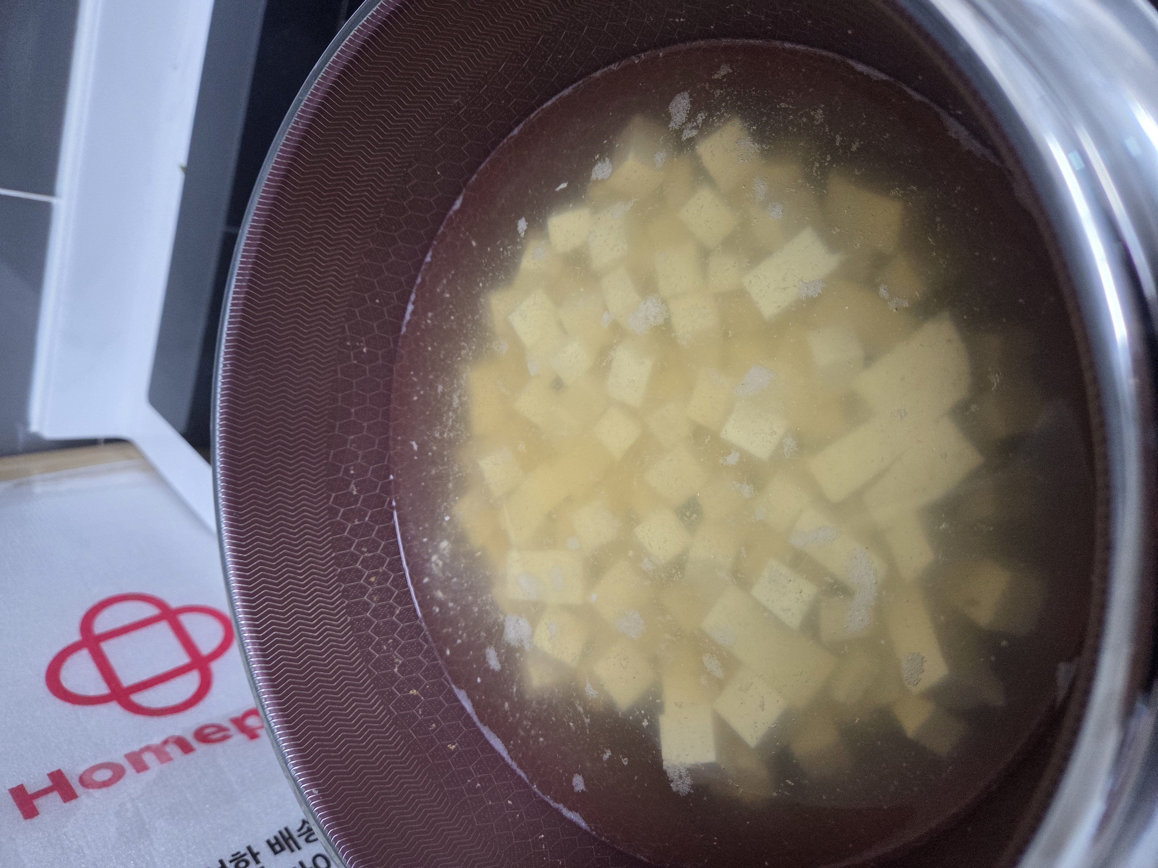 물에 연두링 2개와 연두순 4스푼을 넣고, 두부도 넣어준다. 2-3분 끓여주고 달걀을 젓가락으로 풀어준다. 팔팔 끓어 오를때까지 가만히 두면 된다. 끓기 시작하면 불을 끄고 파를 넣어준다