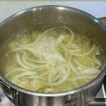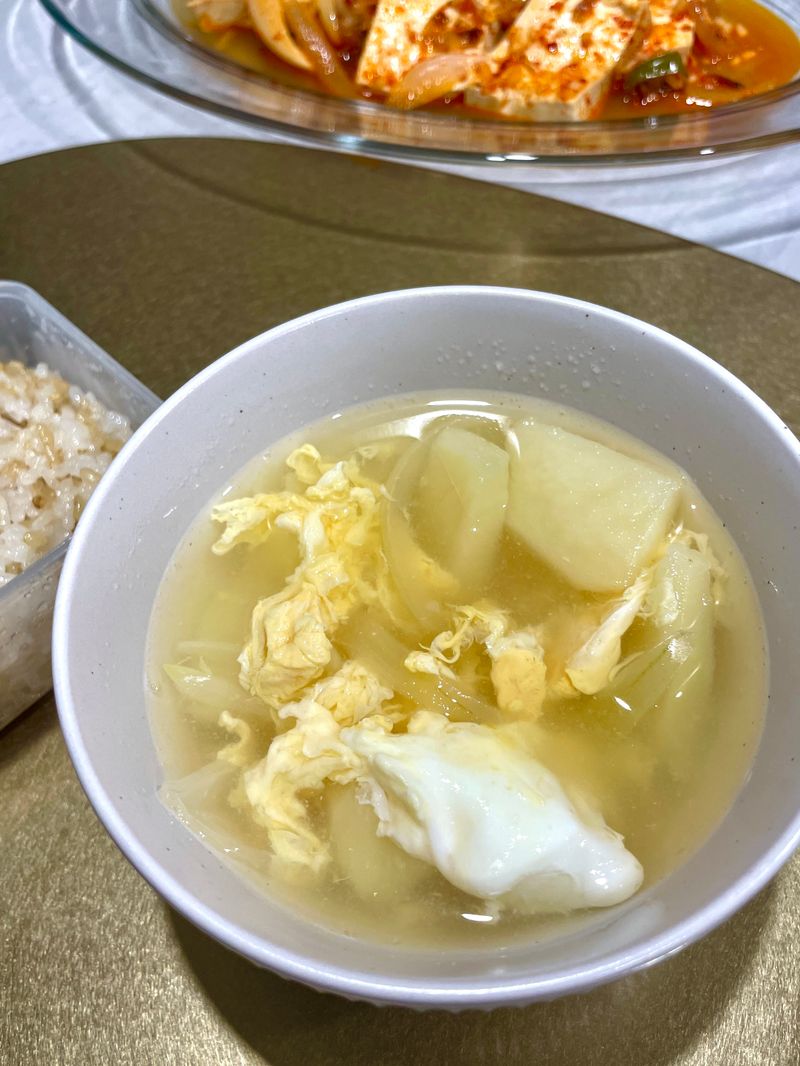 끓는 물에 감자를 먼저 넣어 살짝 더 익힌 뒤, 양파와 청양고추를 넣습니다. 다 끓이고 마지막에 계란물을 붓습니다. 완성!