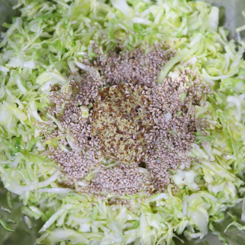 3. 볼에 양배추와 양파를 담고 들기름, 레몬즙, 연두순, 홀그레인 머스타드, 통깨를 넣어 잘 버무려주면 완성!