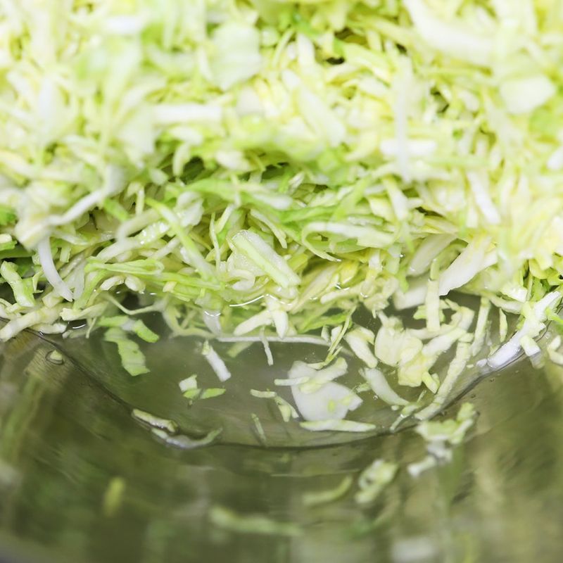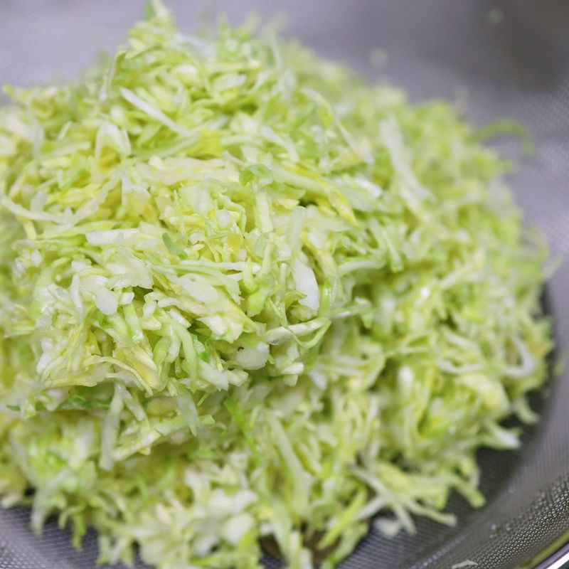 2. 양배추와 양파에 소금을 넣고 30분 정도 절여주세요. 숨이 죽으면 체반에 옮겨담은 후 손으로 꽉 짜서 물기를 제거해주세요.