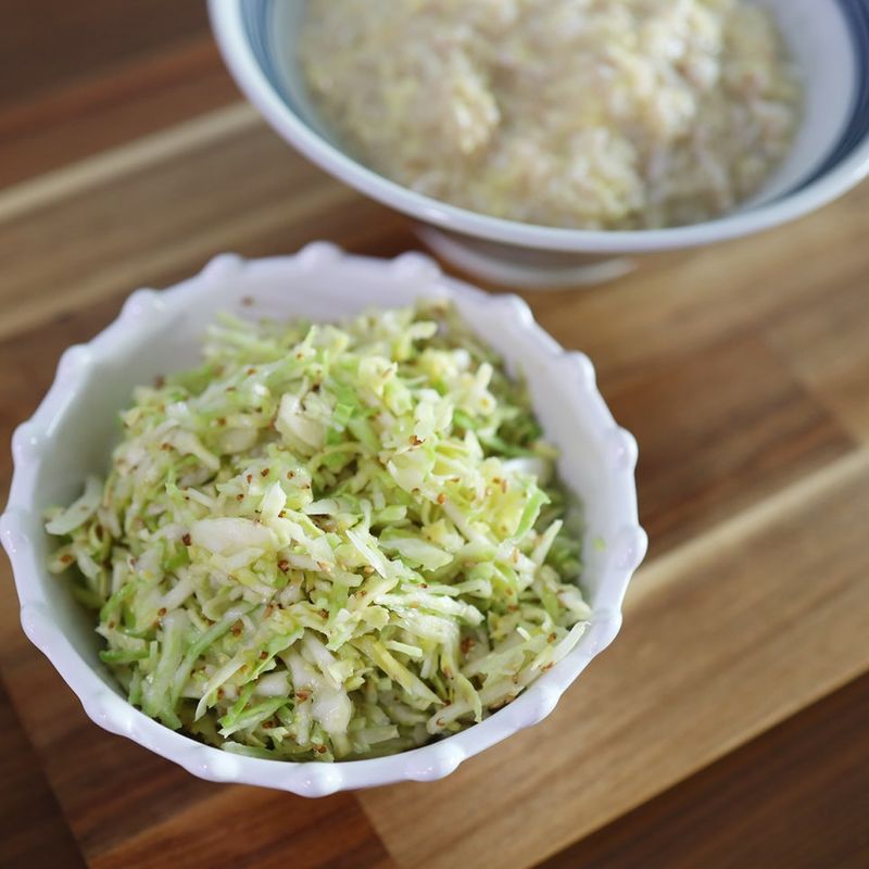 재료 : 양배추 400g, 양파 1개, 들기름 4스푼, 레몬즙 4스푼, 연두순 2스푼, 홀그레인머스타드 2스푼, 통깨 2스푼, 소금(절임용) 1스푼