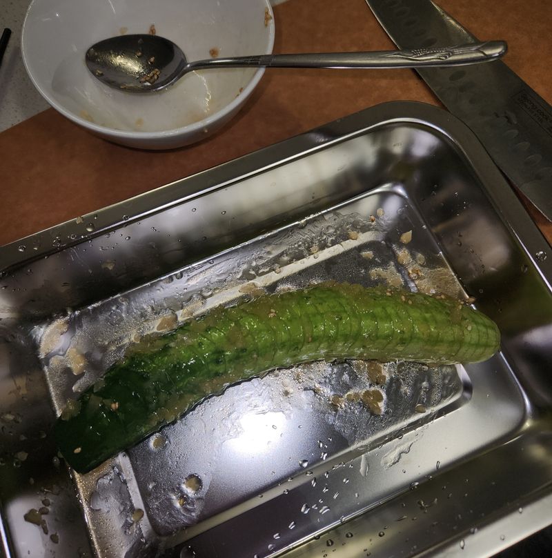 만드는 과정은 정말 간단했어요! 오이를 자를 때 젓가락을 양옆에 딱 고정해두고 대각선으로 잘라주니까 칼집이 일정하고 안정적으로 들어가서 훨씬 편했어요! 꿀팁 감사합니당💚 양쪽 모두 사선으로 칼집을 내어주면 스프링처럼 쫘악- 늘어나는 게 정말 신기하더라고요. 그리고 양념장까지 너무 고소하고 맛있었어요!!