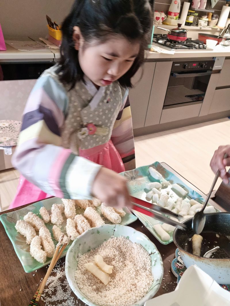 가족들과 처음으로 도전한 한과만들기 ~^^ 한복입고 단아한 모습으로 달콤한 한과만들기 도전 !!! 조청에 너무 오래 담그지 말고 금방꺼내서 돌돌 굴려주면~ 쉽게 완성가능해요 ^^ 명절을 맞아서 식구들 함께 맛볼 수 있는 요리를 아이와 함께 같이 완성하니 더욱 뿌듯해했어요~