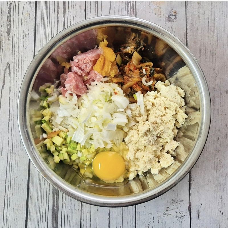 묵은지(쫑쫑),돈민찌100g,얼린두부250g(물기제거), 양파 반 개(다짐), 대파 반 대(다짐), 애호박(5cm정도 다짐), 다진마늘1, 맛술1, 간장1, 소금&후추 약간, 밀가루 4~5스푼(재료 수분에 따라 가감), 달걀 1개