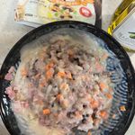 썰어둔 채소 + 베이컨 + 밥 + 식용유 2스푼 + 크림 파스타 소스를 골고루 섞어주세요.