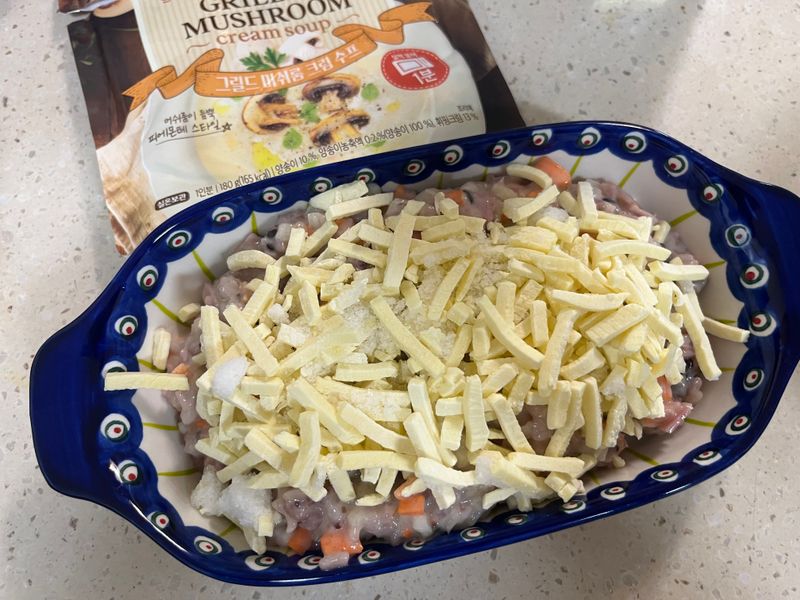 용기에 담고 모짜렐라 치즈를 듬뿍 뿌린 뒤