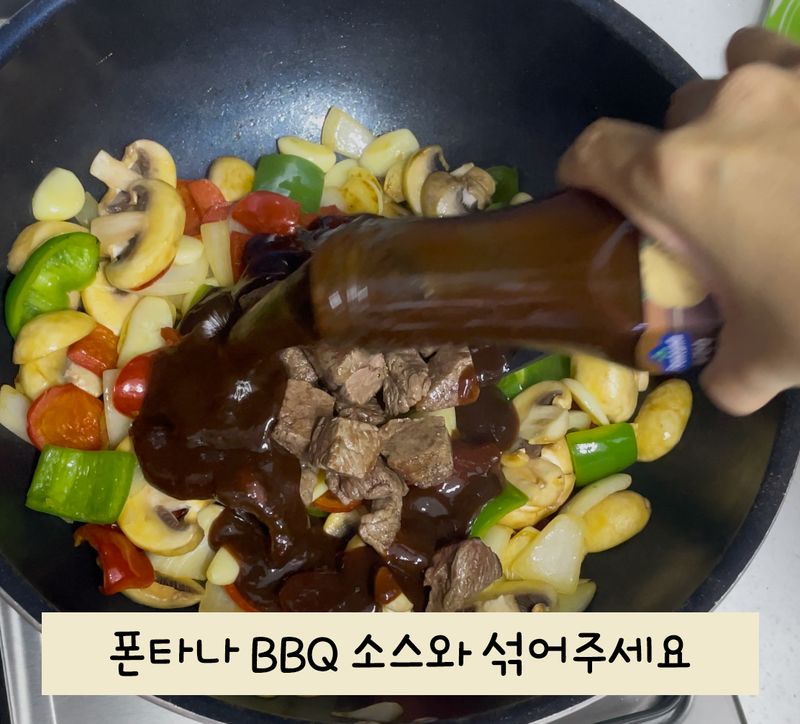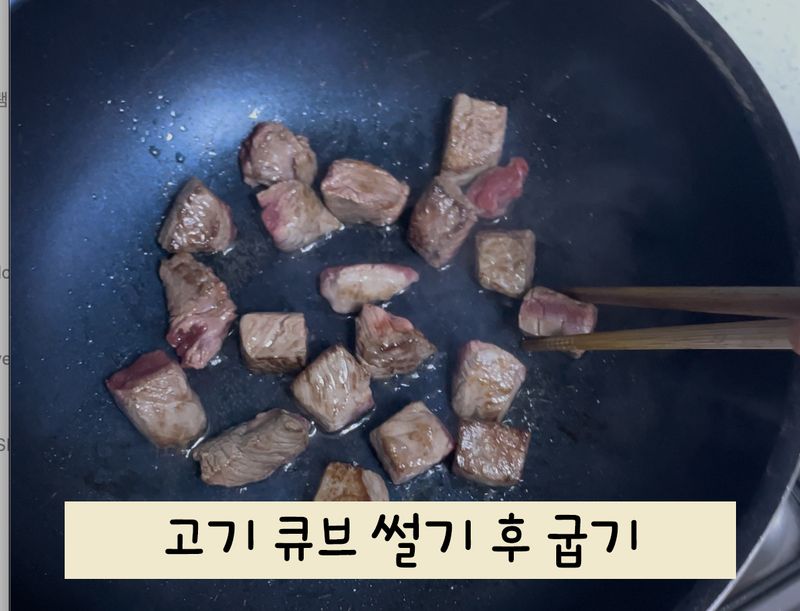레시피에 나와 있는 대로 고기 먼저 볶고 야채를 나중에 볶아주었어요.