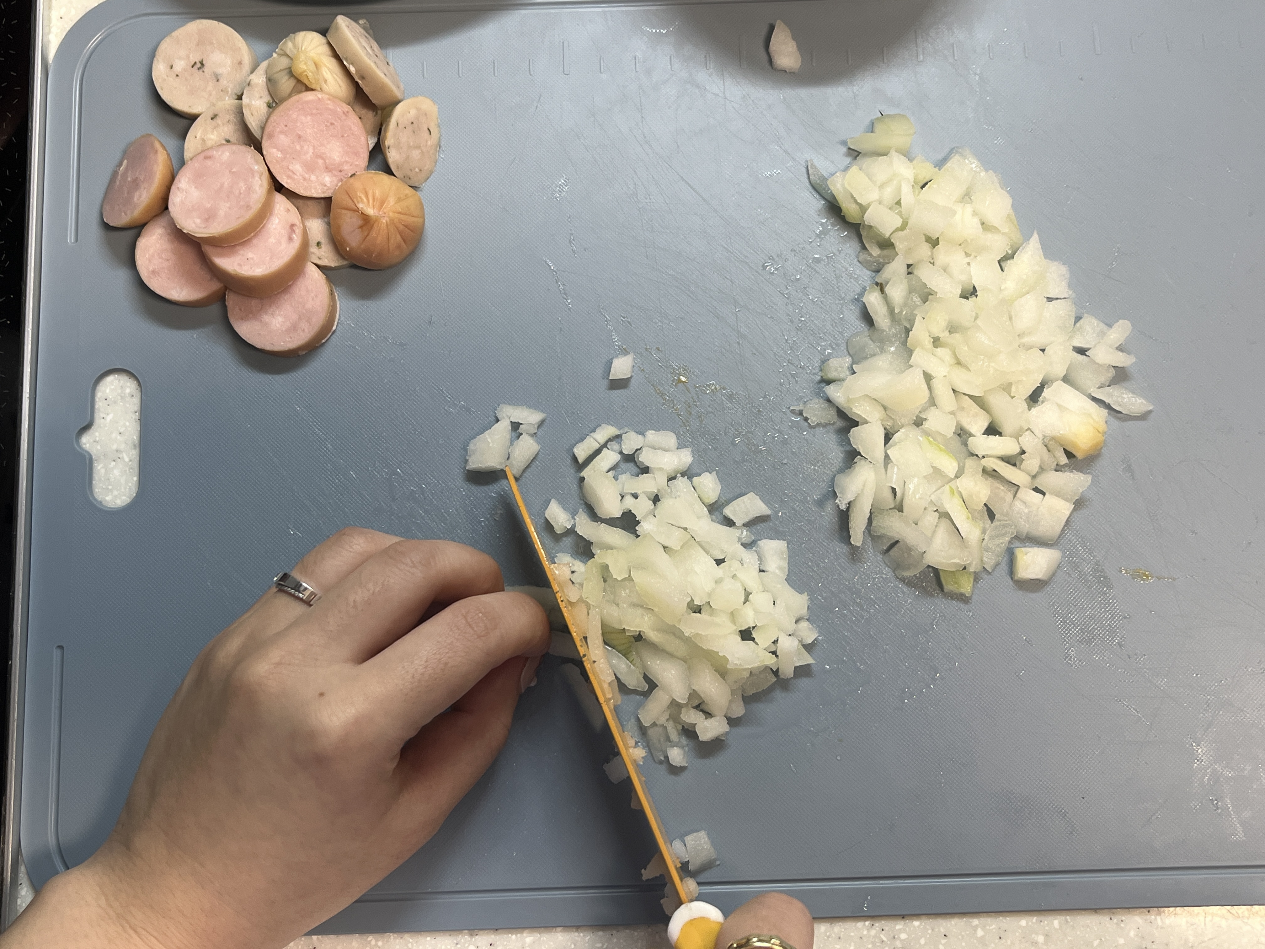 양파와 비엔나 소시지를 먹기 좋은 크기로 썰어 준비합니다.
