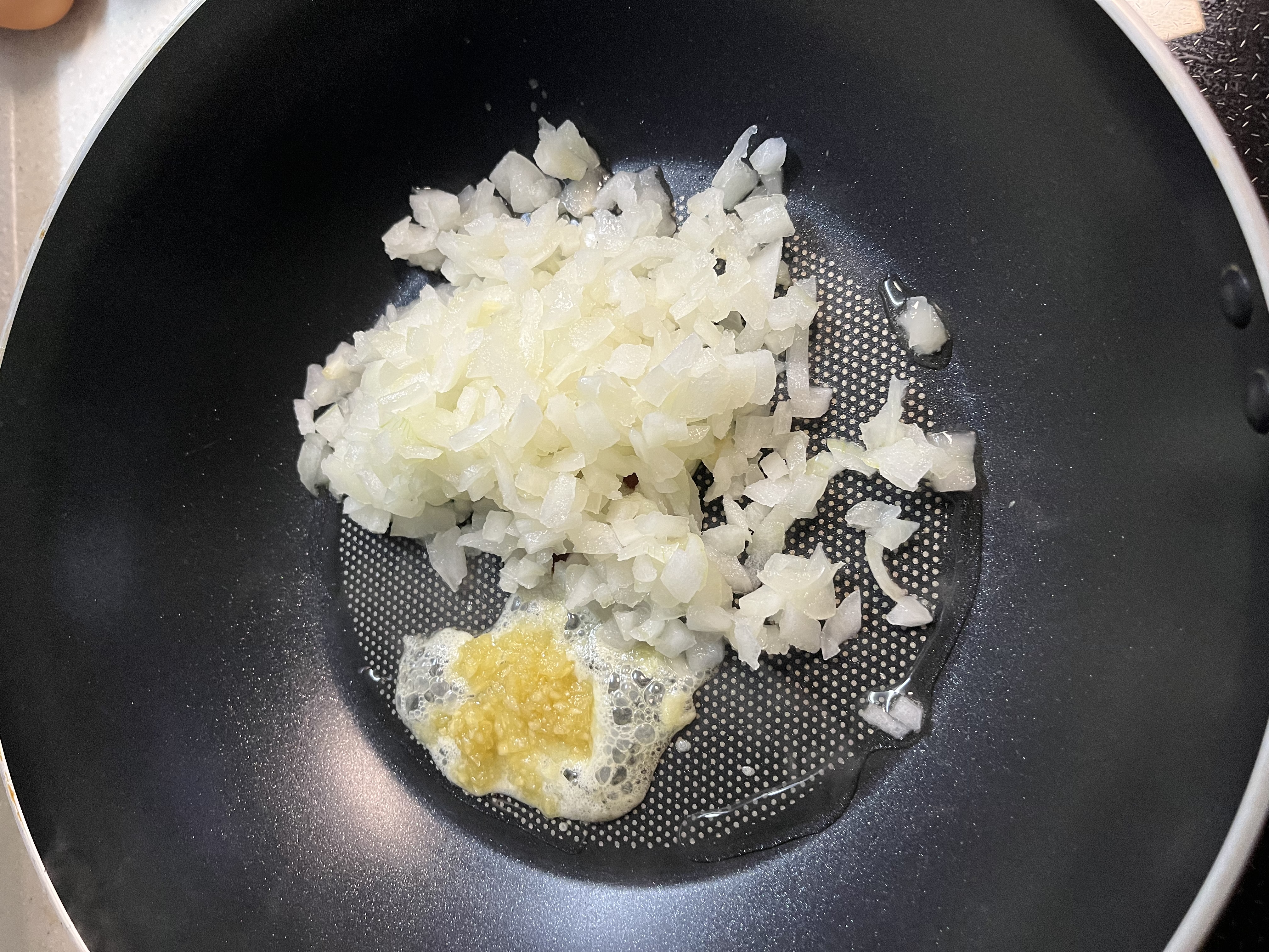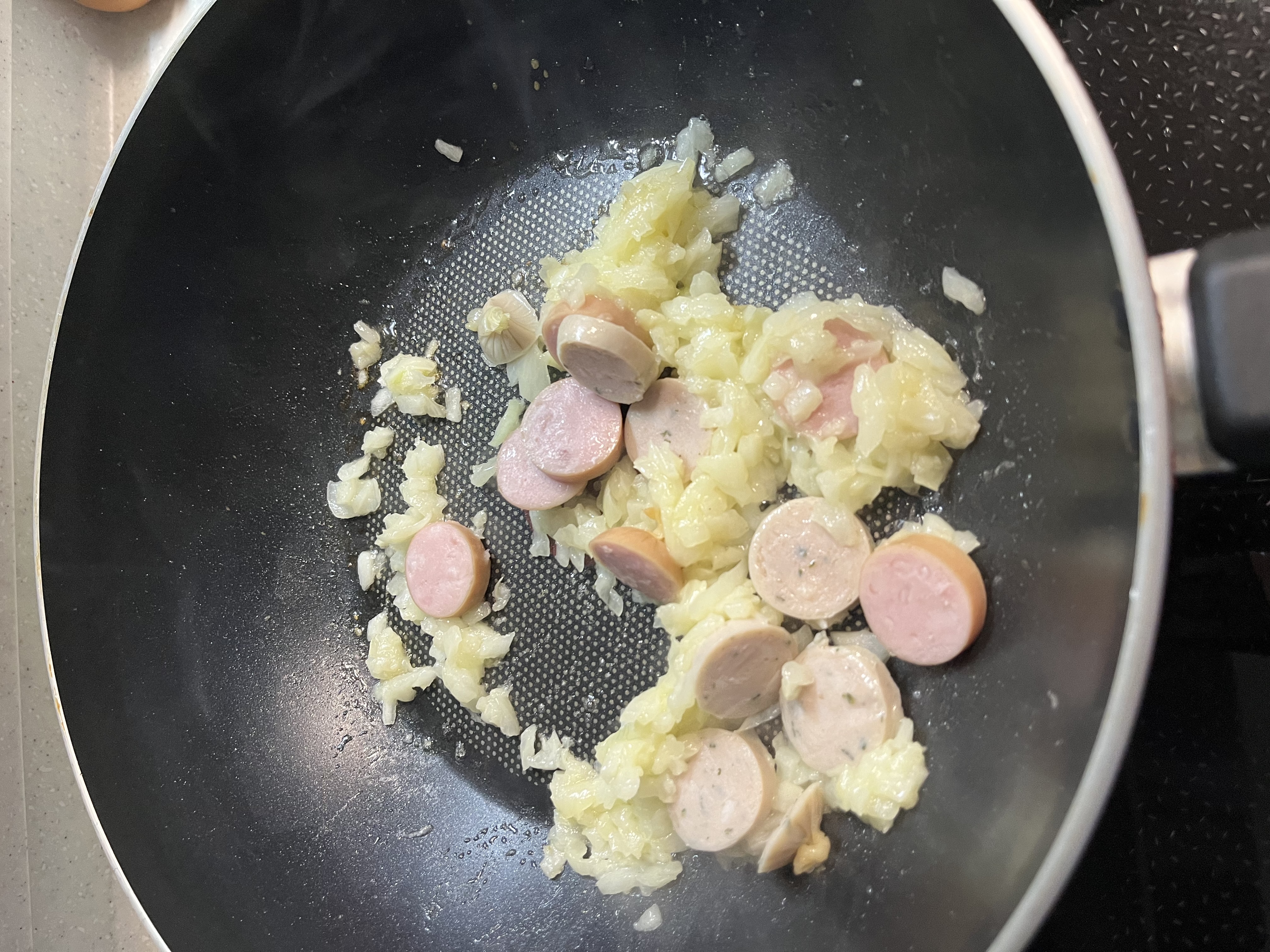 팬에 식용유를 두르고 다진마늘, 양파, 비엔나 소시지를 넣고 볶습니다. 재료가 어느정도 익으면 소스 1봉지를 넣어 주세요.