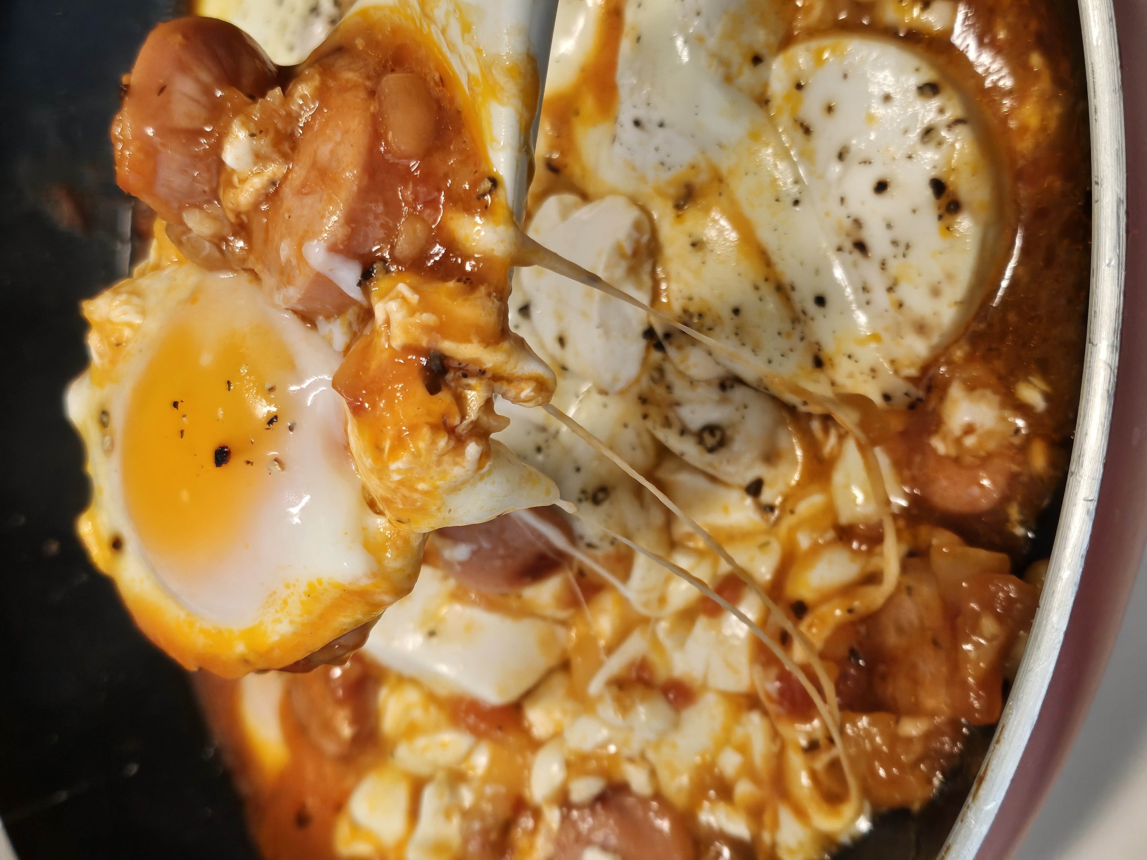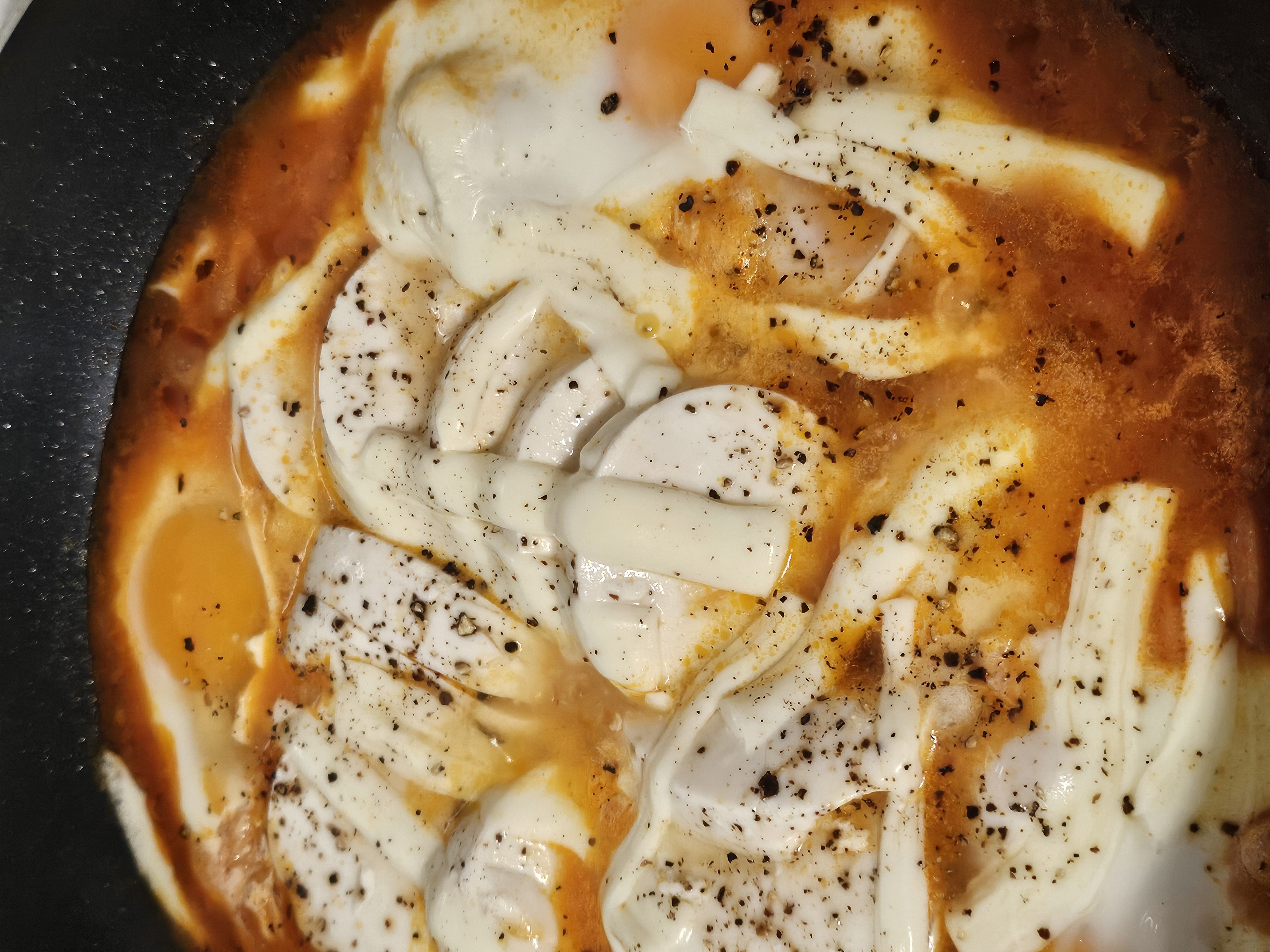 달걀과 순두부를 넣고 뚜껑을 덮어 익혀줍니다. 마지막으로 스트링치즈를 올리고 후추를 뿌려주면 완성!