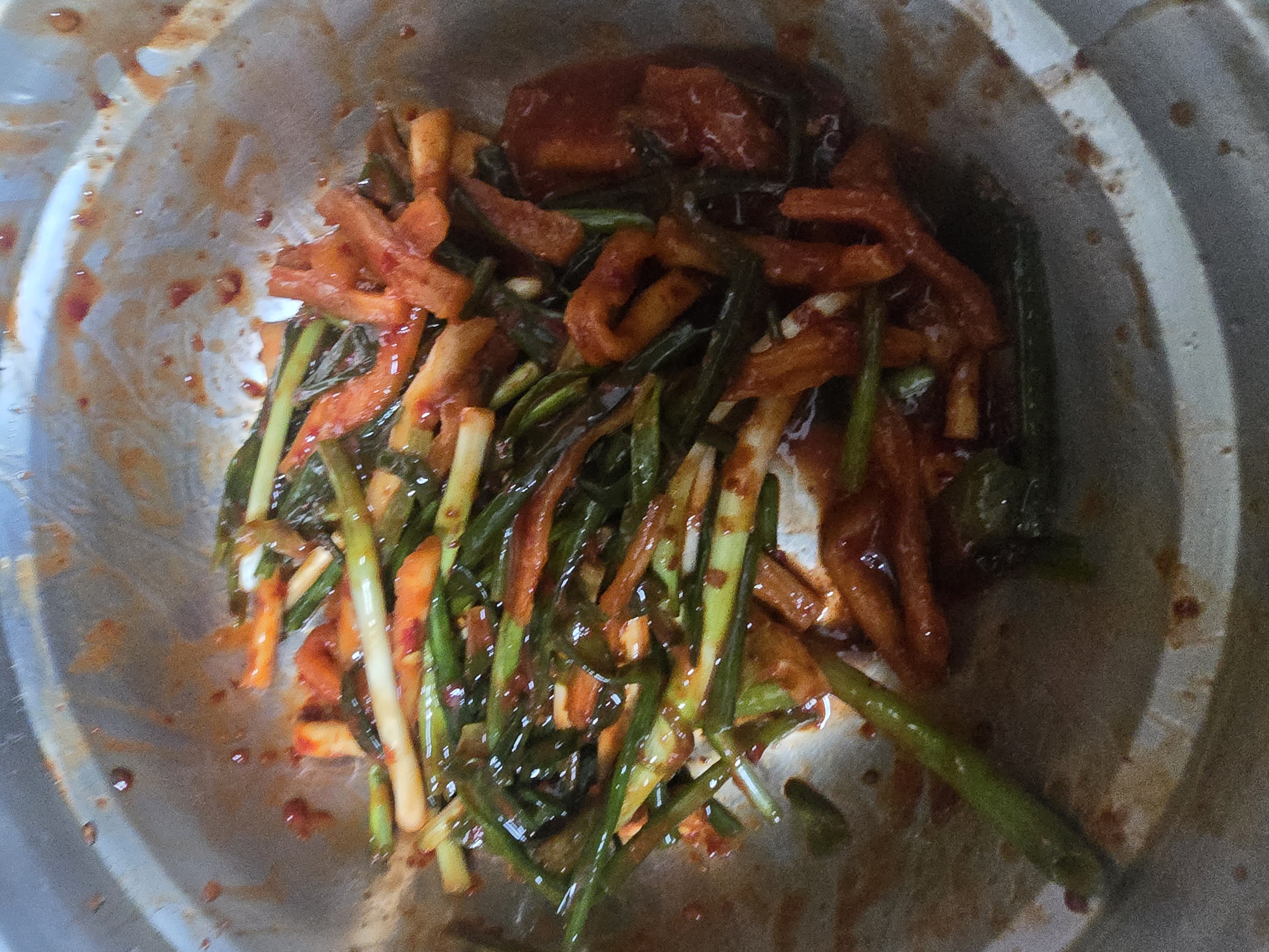 그래서 이가없으면 잇몸! 정신으로다가 무말랭이와 파를 구매해서, 파를 잘라서 소금에 절인후에 무말랭이와 섞었습니다^-^