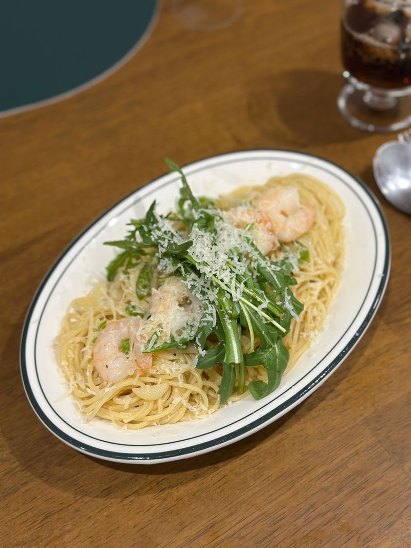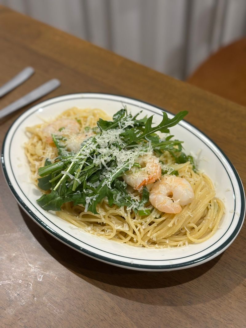 냉동새우, 마늘, 청양고추, 올리브오일, 스파게티면, 루꼴라만 있으면 되요 :)