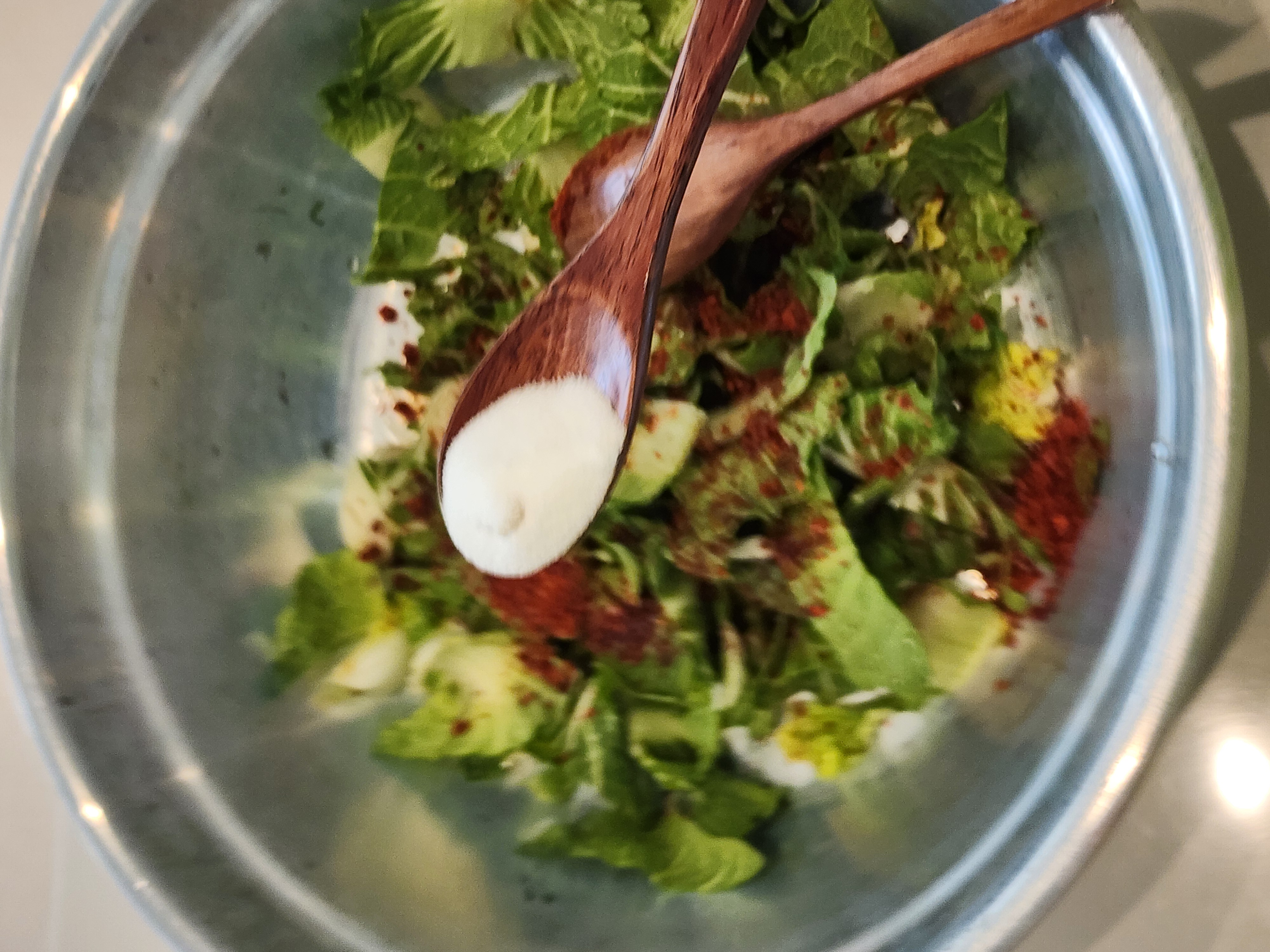 3. 연두 2, 고추가루 2, 설탕 1, 꿀1, 식초1, 참기름 깨 듬뿍 뿌리면 완성.