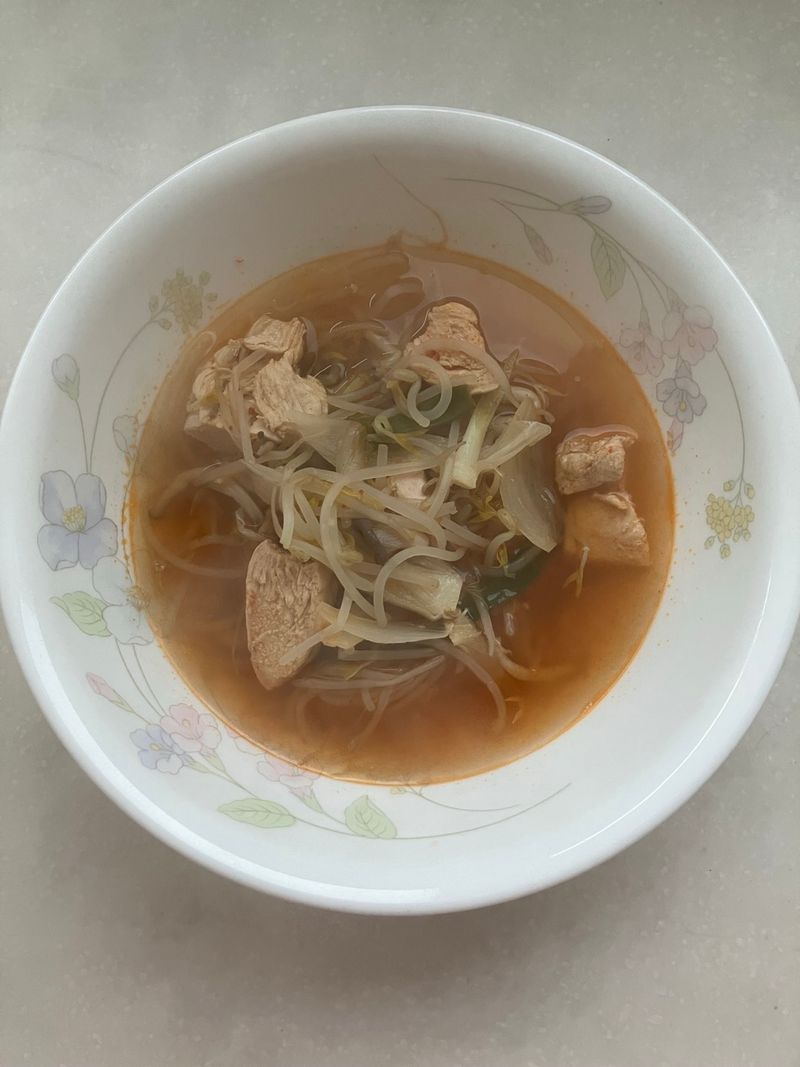육개장 레시피 보고 만들었는데 아주 맛있어요. 소고기 대신 닭가슴살, 고사리 대신 숙주나물을 넣어서 만들었는데 연두링 육수 덕분인지 깊은 맛이에요.
