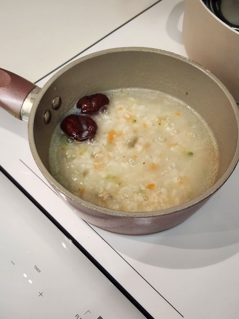 첫째가 감기 기운이 있다고 해서 아침에 야채죽 만들어줬어요.