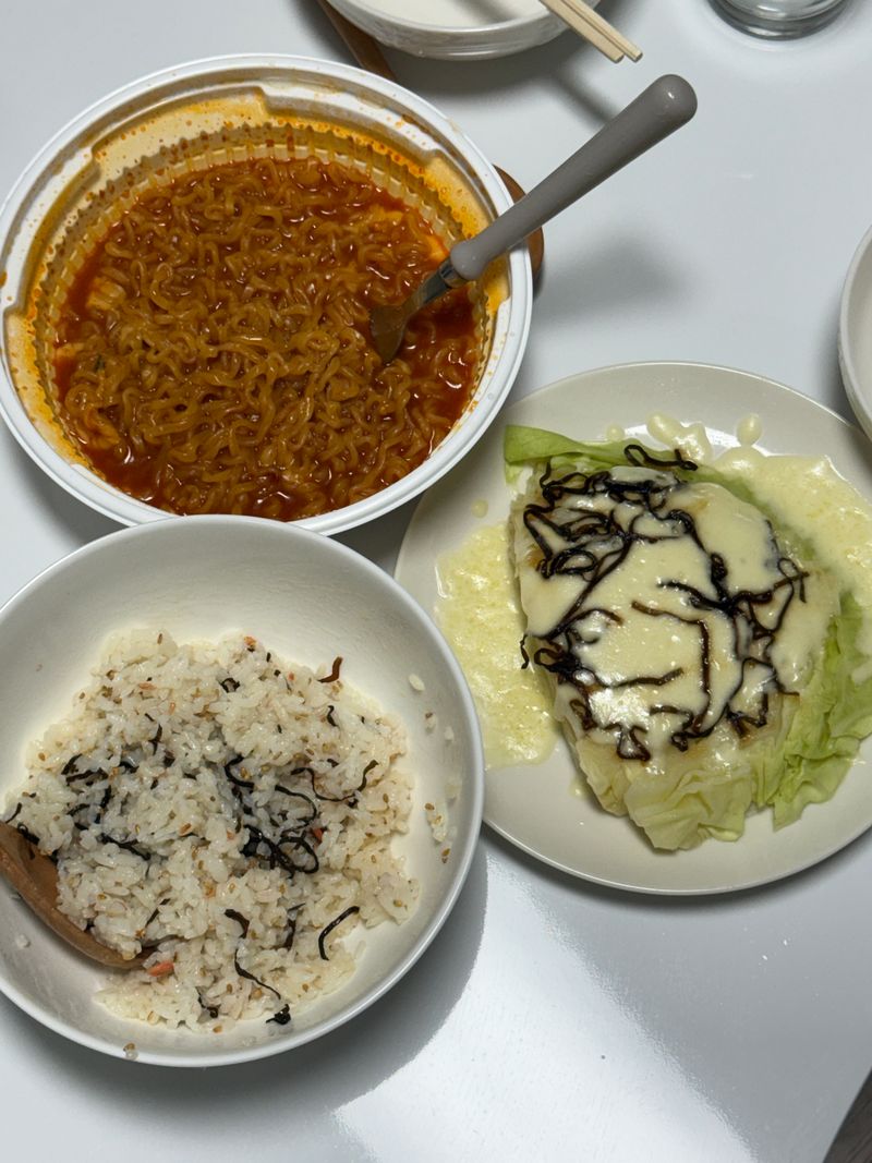 > 양배추 + 연두 조금 물 조금 넣어 전자레인지 3분 돌린 후에